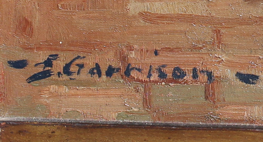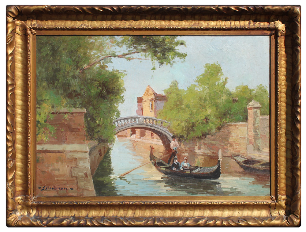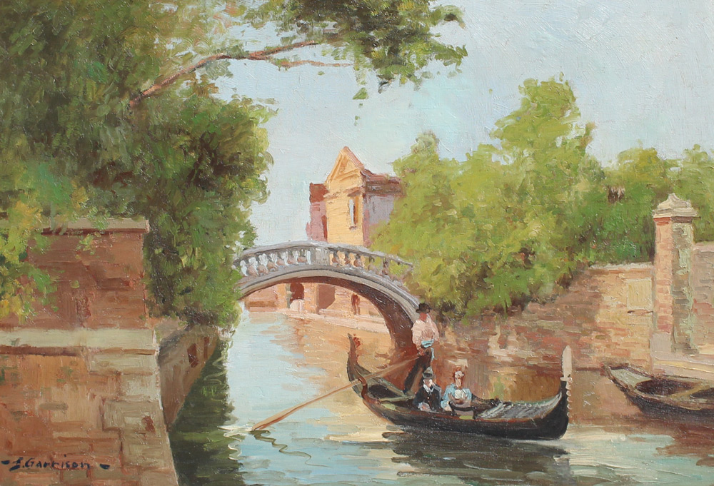 GARRISON, Edith, (American, 20th Century): Venetian Canal Scene, Oil/Canvasboard, 22'' x 32'', signed lower left, encased in carved and gilded gesso frame, 30'' x41''.