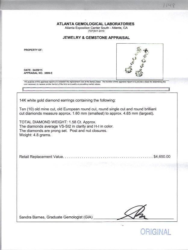 DIAMOND DROP EARRINGS: 14K white gold five element diamond earrings having 10 old mine cut, round brilliant and round single cut diamonds totaling 1.58 Ct., averaging VS-SI2 in clarity and H-I color. Length 1.2''. Weight 1.58. Post and nut closure. Sold with current Atlanta Gemological GIA graduate's appraisal for $4,650.