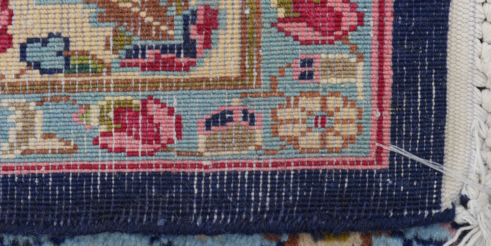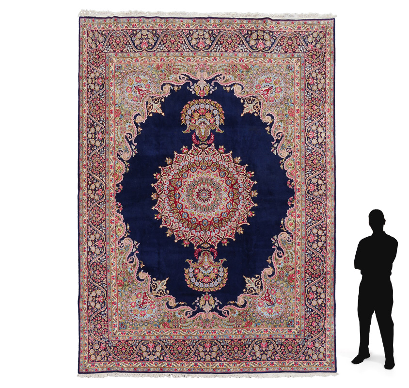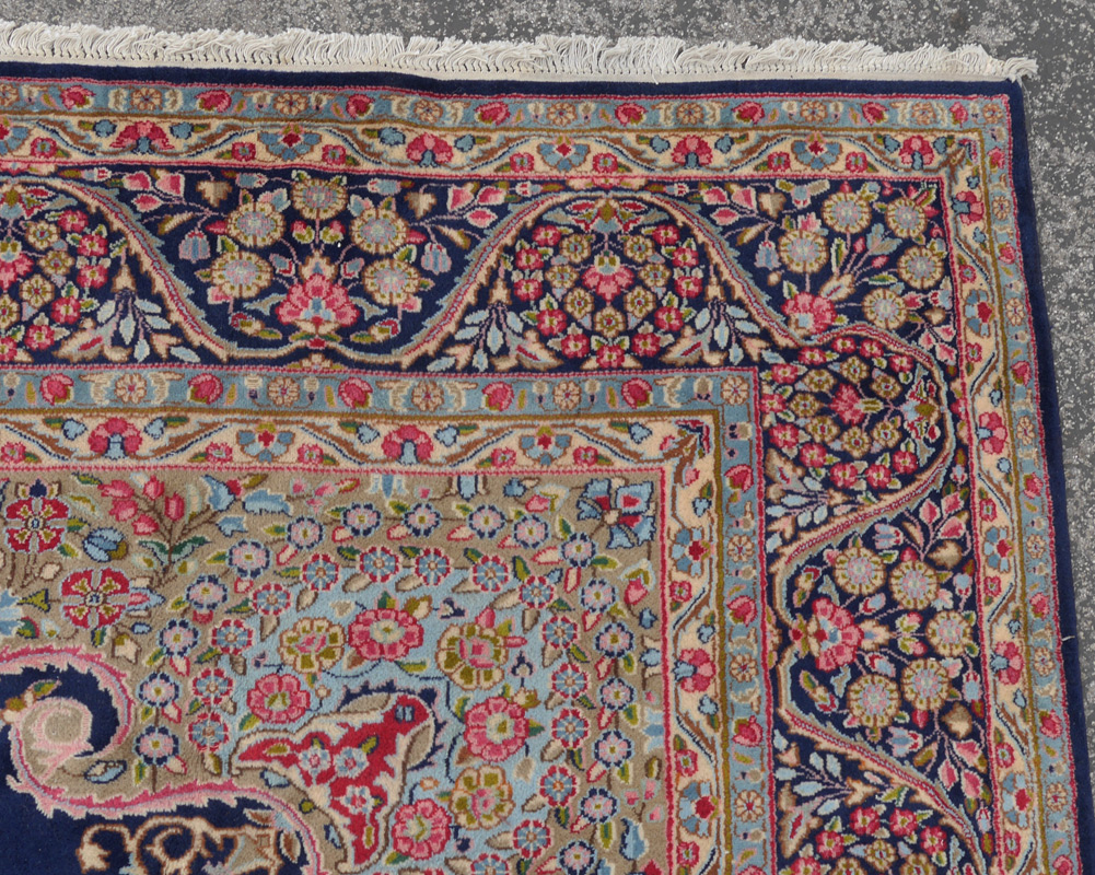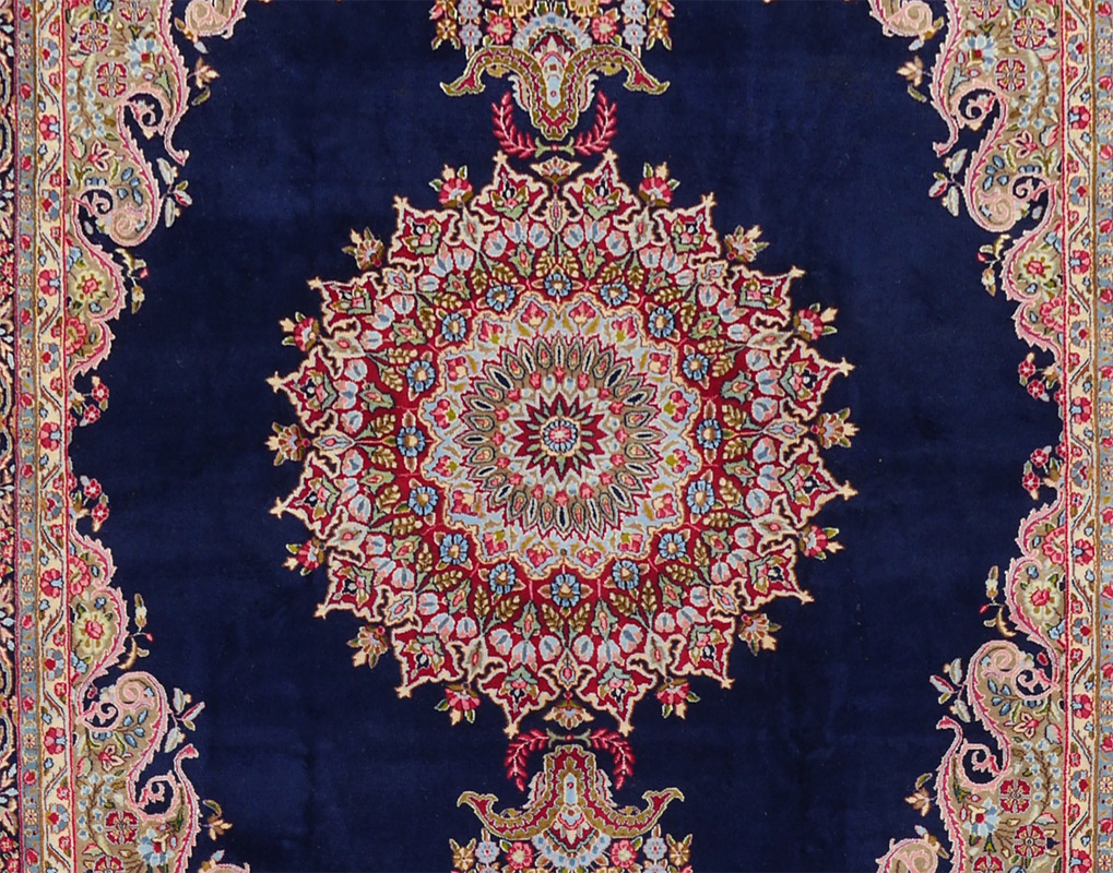 APPROX. 20-45 YR OLD PERSIAN KERMAN HAND KNOTTED WOOL RUG, 9'9'' x 12'5'': This traditional design Kerman has an open blue field with a large round scalloped edge central medallion with large spandrels at either end. The contrast between the softer colors of the medallion, the corners and the borders with the strong, solid blue of the field gives this rugs dramatic look. Condition is good.
