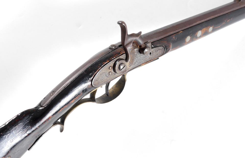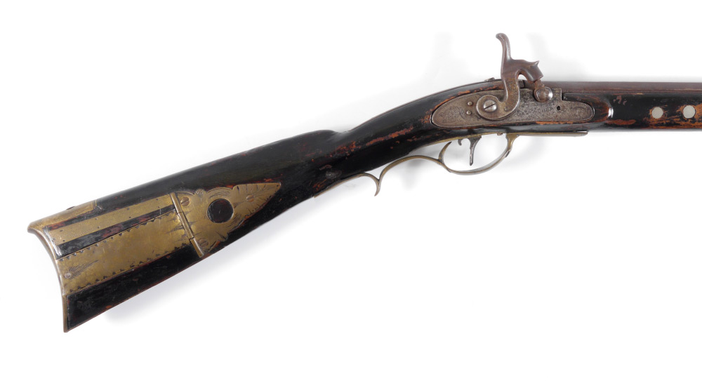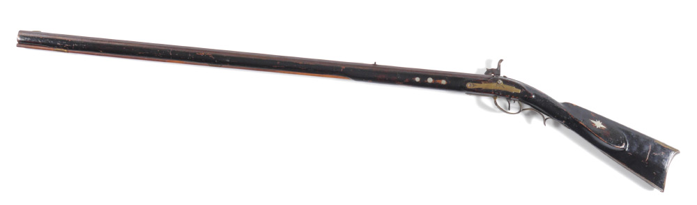1831 H. GIBBS LANCASTER PENNSYLVANIA RIFLE: 36'' octagonal .41 caliber barrel signed H. Gibbs and dated 1831. Henry Gibbs Sr. worked from 1812-1843 in the Lancaster area. Heavily varnished full stock with starburst and diamond inlay decoration, brass furniture and patchbox. Illegibly signed percussion lock, currently functioning. Overall measures 51 1/4'' long.