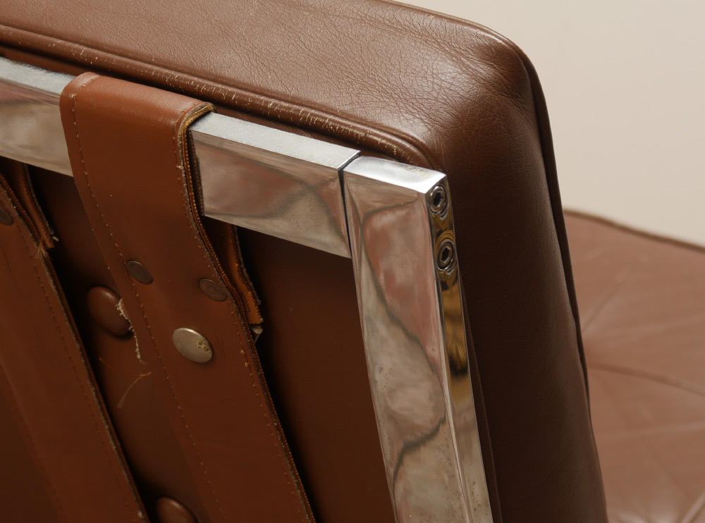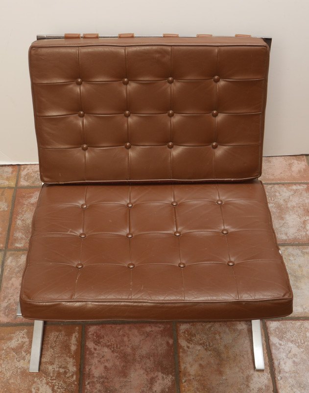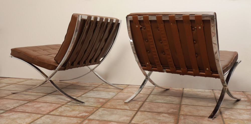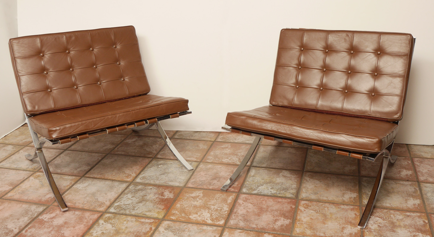 PAIR MID CENTURY BROWN LEATHER BARCELONA CHAIRS: Unmarked, attributed to Knoll, heavy chrome frames with 7 leather strap supports. Tufted brown leather cushions, frames measures 29'' h. x 29 1/4'' x 3 13/4''.
