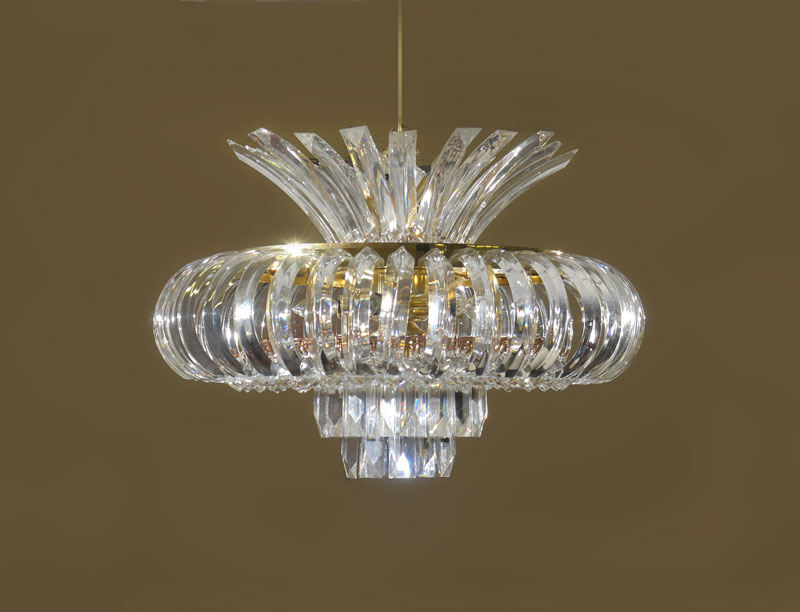 TRI LEVEL ARCHED LUCITE CHANDELIER: Mid century design with shaped tiers of lucite panels. Convex top, concave side ribs, prism drop and lower tiers of straight panels. Brass frame, overall 18'' h. x 25'' diam. approx.