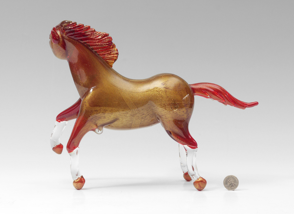 FERRO & LAZZARINI MURANO GLASS HORSE SCULPTURE: Red body, head, and feet with aventurine accents, clear legs. Purchased at Ferro & Lazzarini in Murano in 2013. Overall measures 10 1/2'' x 13 1/2'' x 4 1/2''.