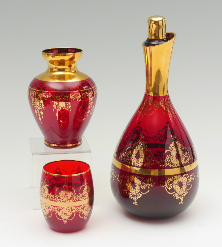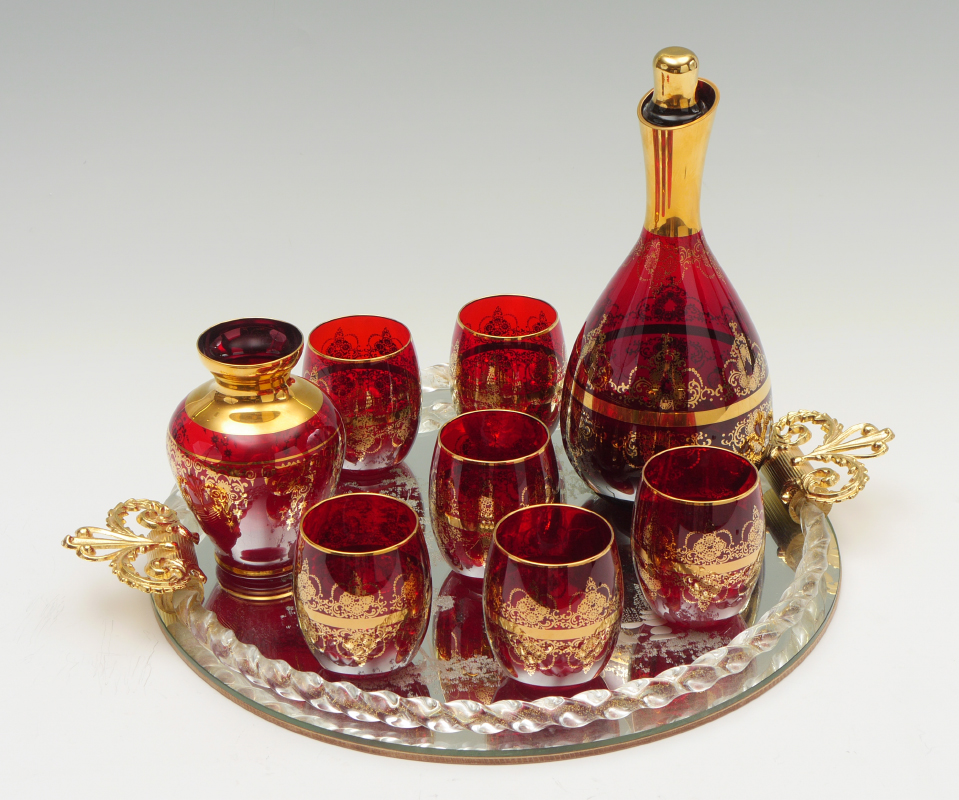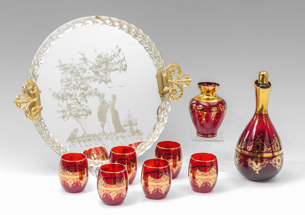 FERRO & LAZZARINI MURANO GLASS TRAY & DECANTER SET: Assembled collection of 9 pieces purchased at Ferro & Lazzarini in Murano in 2013 to include 1-8) Cranberry glass with gilt accent decanter set, decanter (10'' h), 6 glasses (3''), vase (5'' h. ). 9) Mirrored tray with lovers genre scene, twist glass trim with aventurine accents, gilt metal handles. 2'' h. x 17 1/2''.