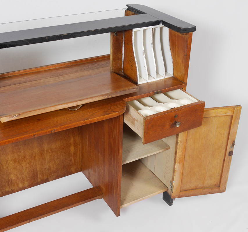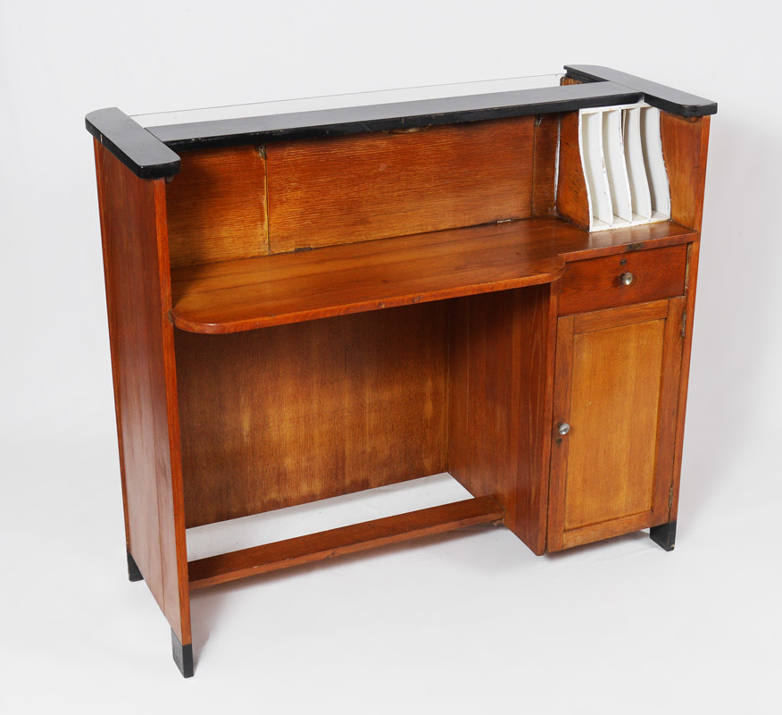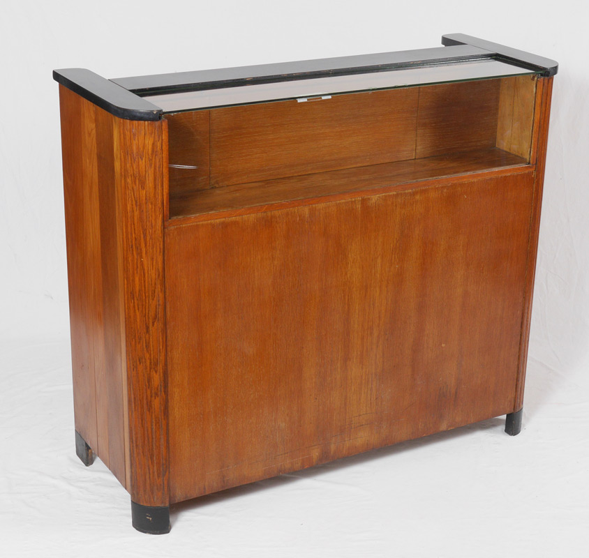 ART DECO STORE DISPLAY COUNTER: Glass front display, fluted rounded stiles, ebonized counter top. Back of counter with door for display access, shaped counter, compartmented, single drawer over single door. Overall measures 41 1/4'' h. x 47 3/4'' x 23''.