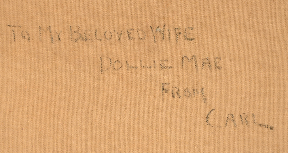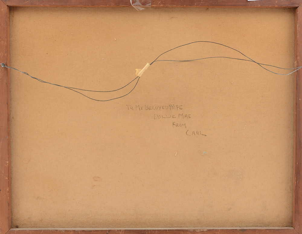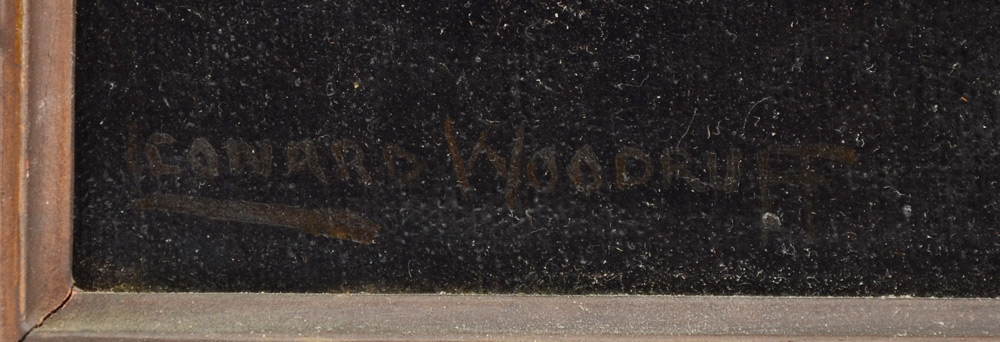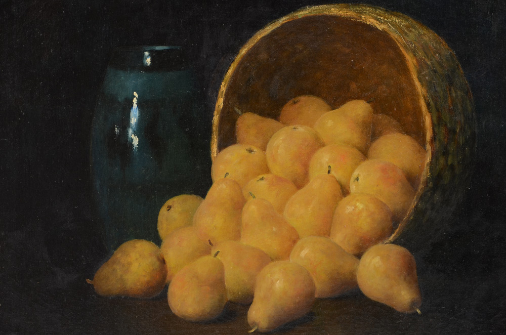 WOODRUFF, Leonard, (American, 1880-1970): ''Tipped Over'', Still Life of Pears in a Basket, Oil/Canvas, 24'' x 30'', signed lower left, titled on a tag which is affixed to the mid-center portion of the frame, carved and painted wood frame, 31.25'' x 37''. Dedicated verso ''To My Beloved Wife Dolly May from Carl''.