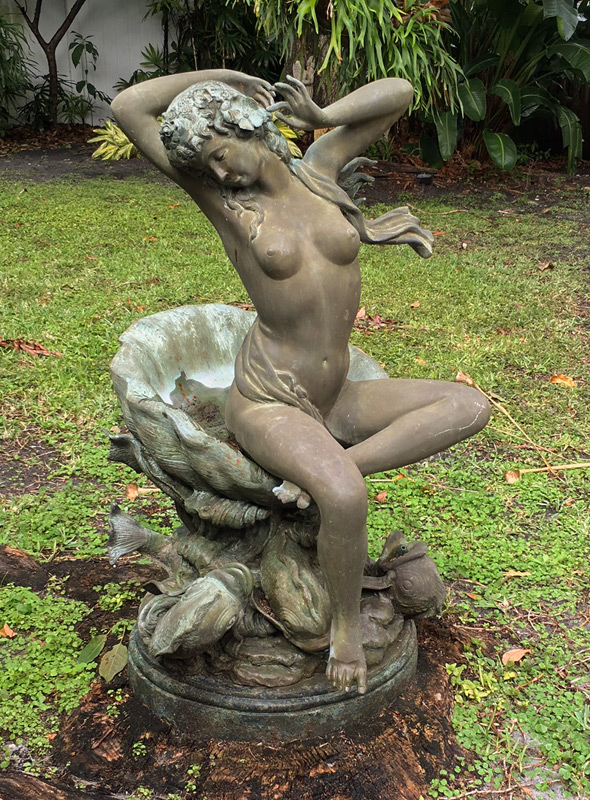 LARGE BRONZE NUDE FOUNTAIN: 2 pc, with Female Nude seated in a clamshell, not attached, atop swirling olde world style dolphin-like fish, 3 of which have spouts, 43'' h.