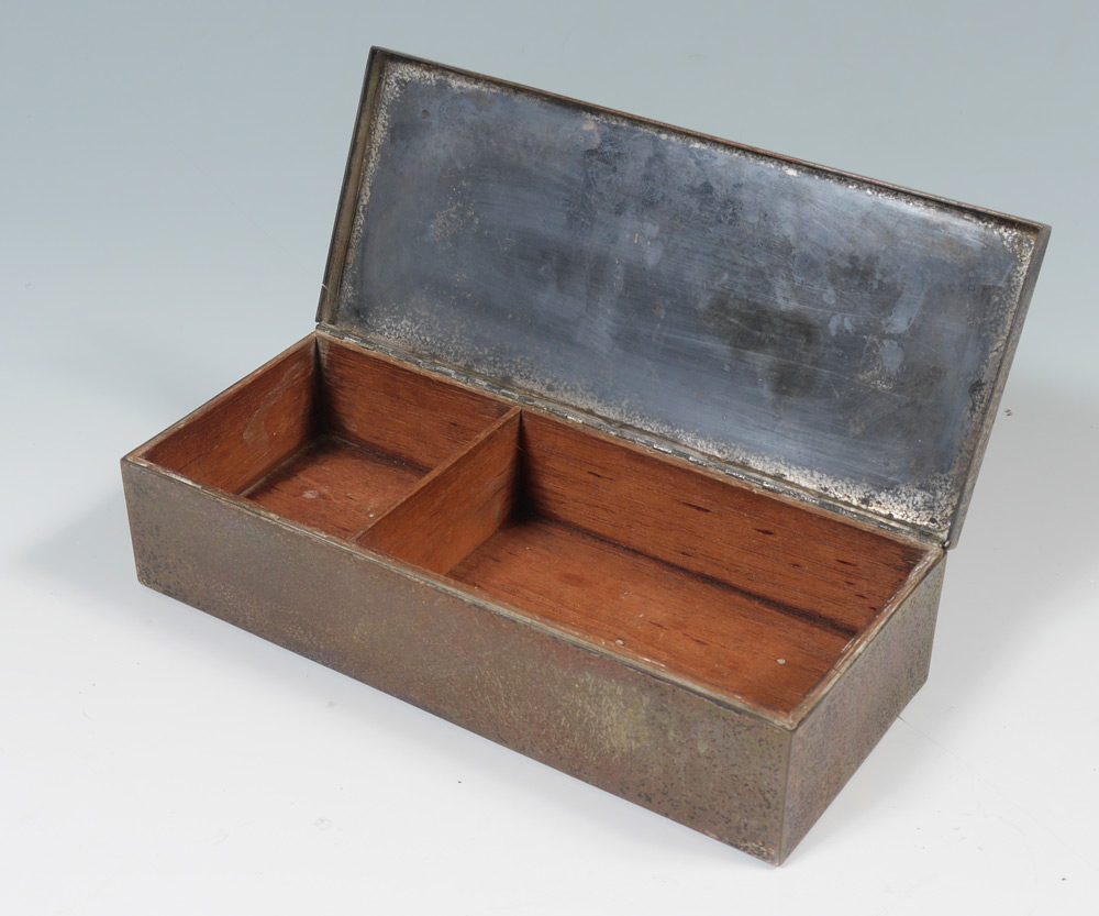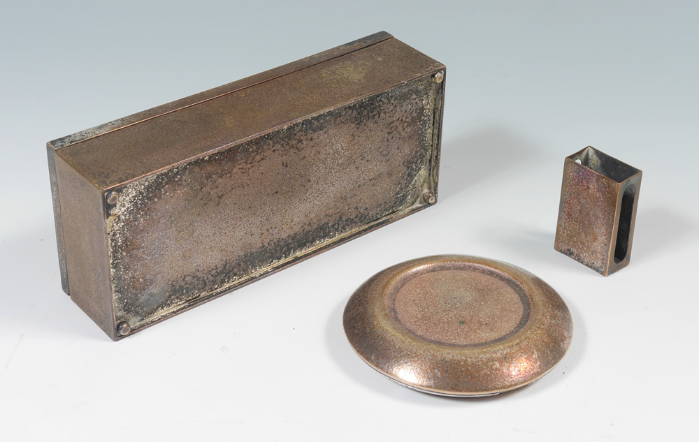 3 PIECE SILVERCREST STERLING ON BRONZE SMOKING SET: 3 pieces total marked ''Silvercrest, Sterling Decorated Bronze'', to include 1) Hinged cigarette box with compartmented wood interior, 2 1/4'' h. x 9'' x 4''. 2) Ashtray, 4 3/4'' dia. 3) Matchbook cover, 3/4'' x 2 1/2'' x 1 1/2''.