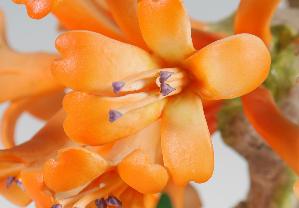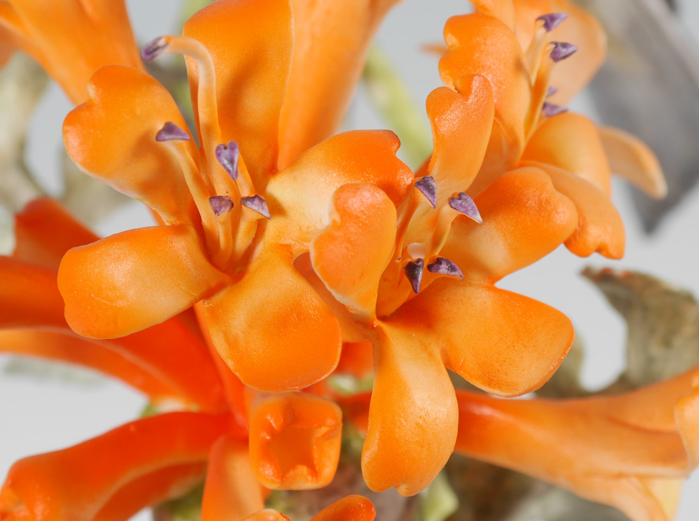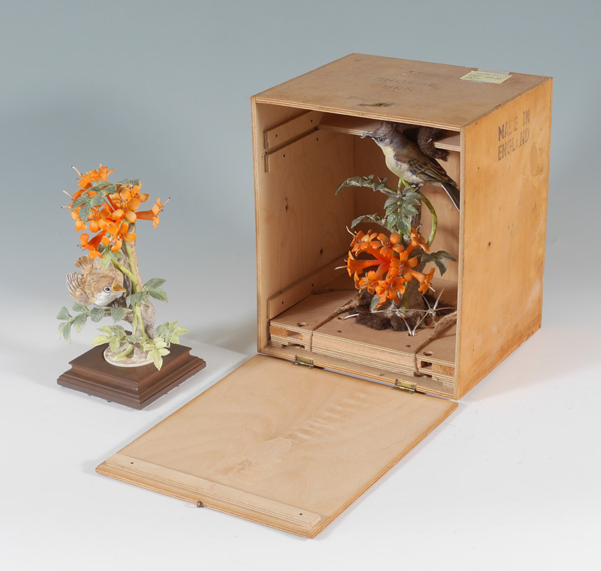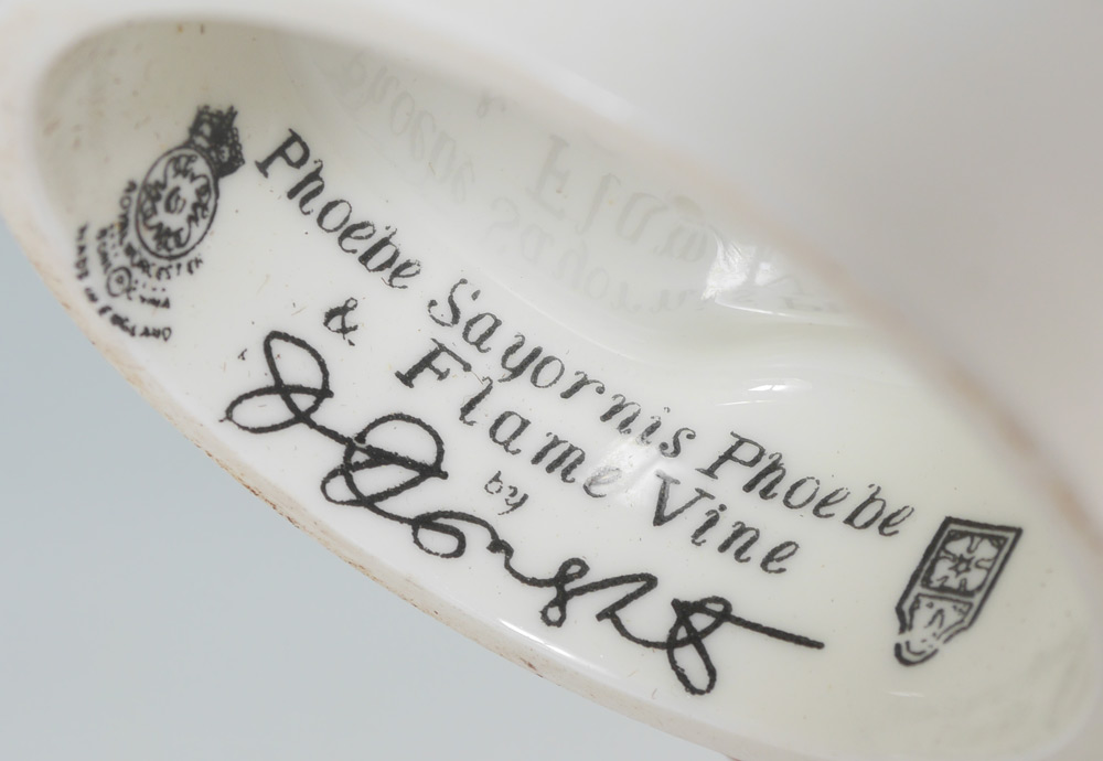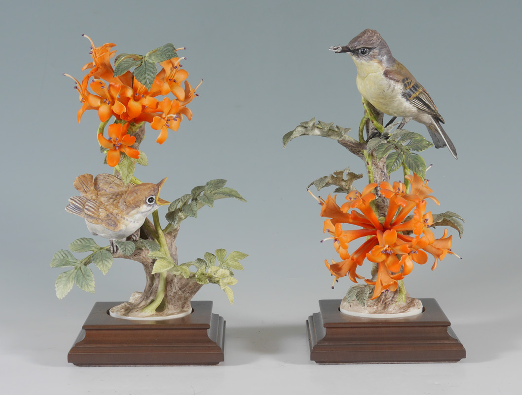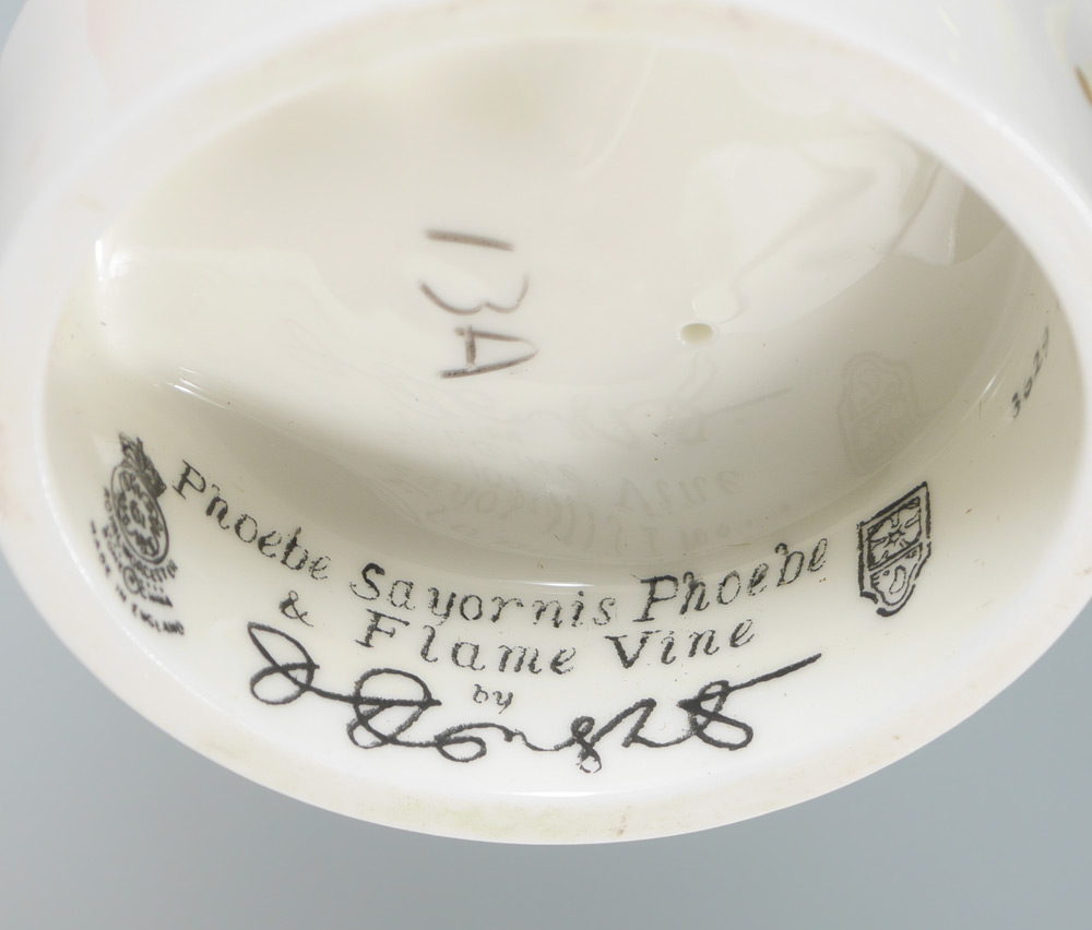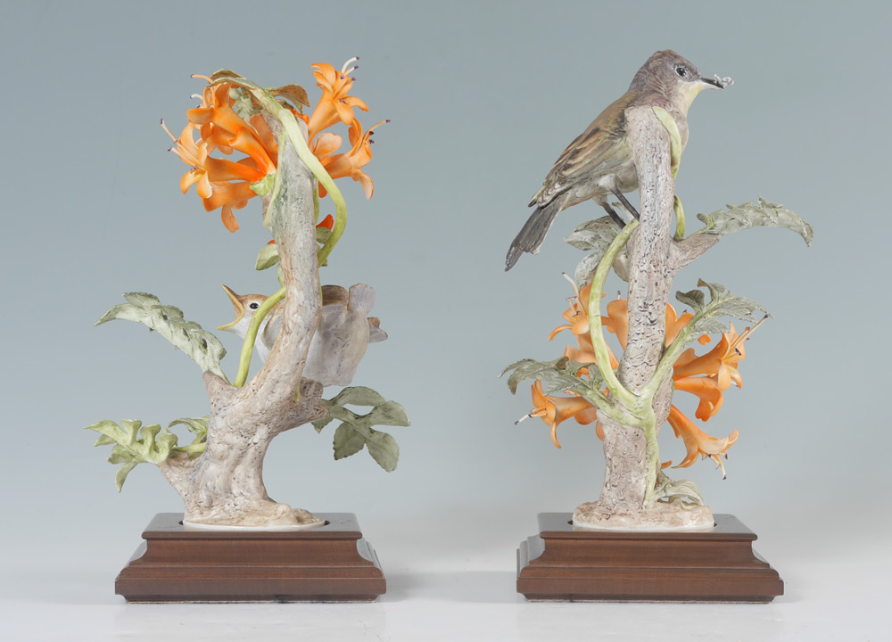 PAIR DOROTHY DOUGHTY PHOEBE PORCELAIN BIRDS: 2 piece total, each on flame vine, to include 1) Hen with insect in mouth, 9'' h. x 6'' x 5'', stand, 1 1/4'' x 5'' x 5'', original packing box, 12 1/2'' h. x 6 1/2'' x 9 1/2''. 2) Chick with open mouth in stand, 10 1/2'' h. x 6 1/2'' x 6''.