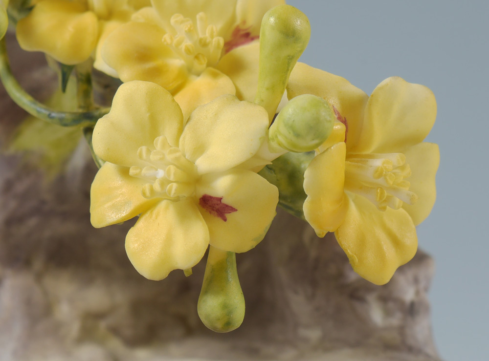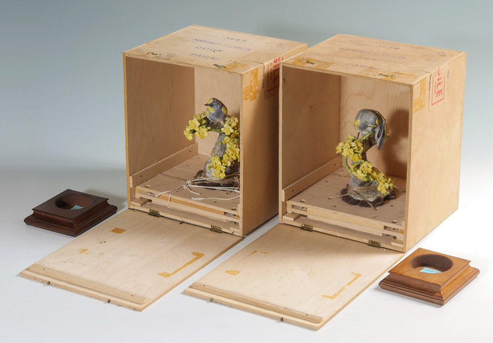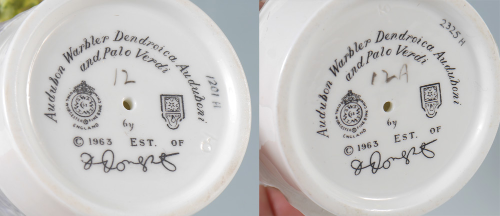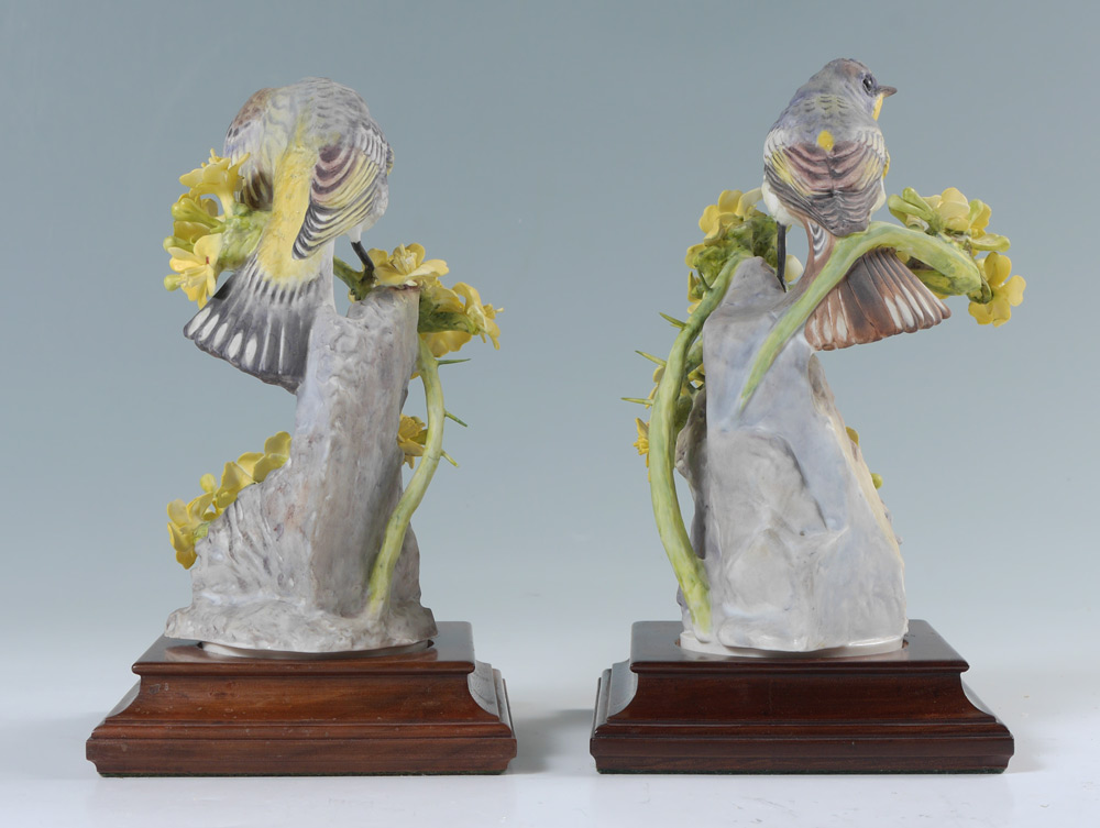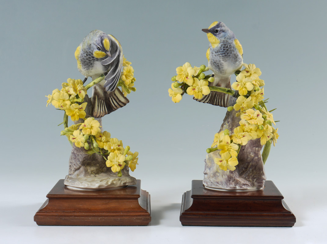 PAIR DOROTHY DOUGHTY AUDUBON WARBLER PORCELAIN BIRDS: 2 pieces total each on Palo Verdi, to include 1) Hen, 7 1/4'' h. x 4 3/4'' x 3'', stand 1 1/4'' h. x 5'' x 5 1/2''. 2) Cock, 7 1/2'' h. x 4 1/2'' x 4 1/2'', stand 1 1/4'' x 5'' x 5 1/2''. Sold with the original packaging boxes, 12 1/2'' h. x 10 1/2'' x 9 1/2''.
