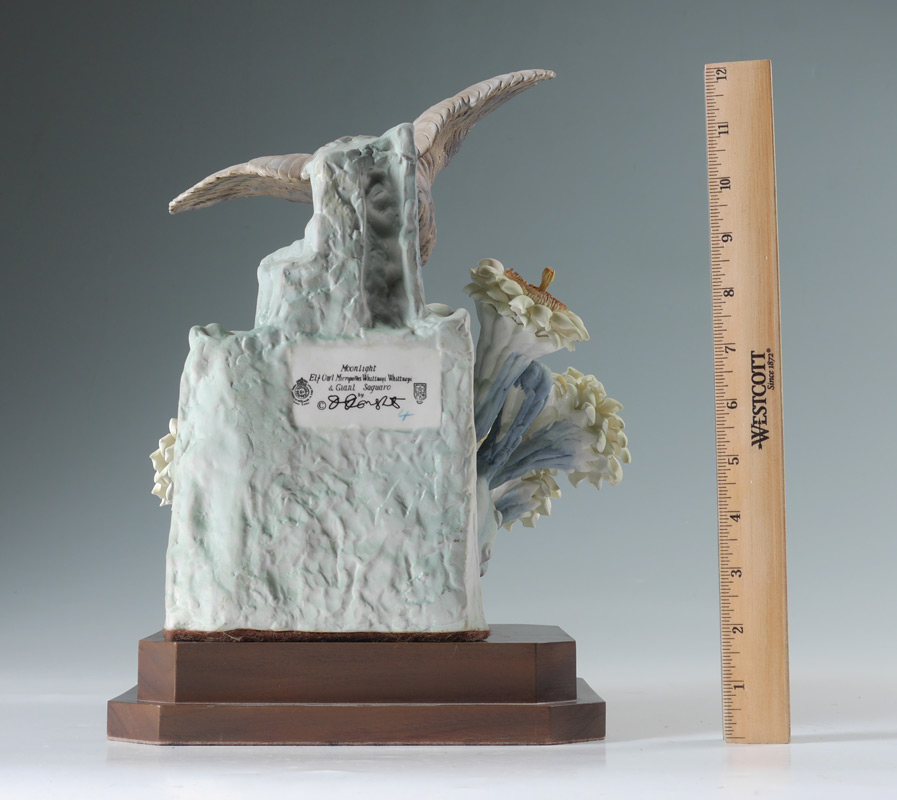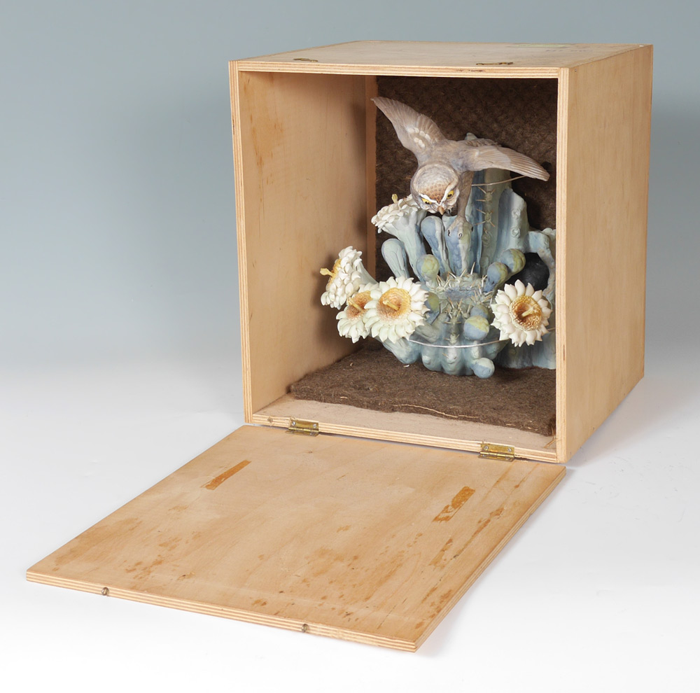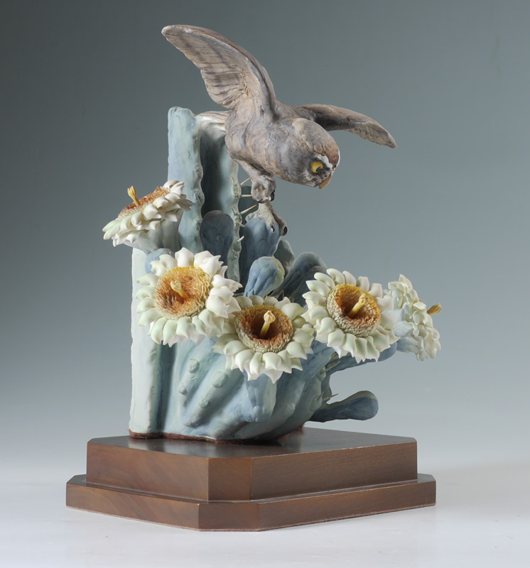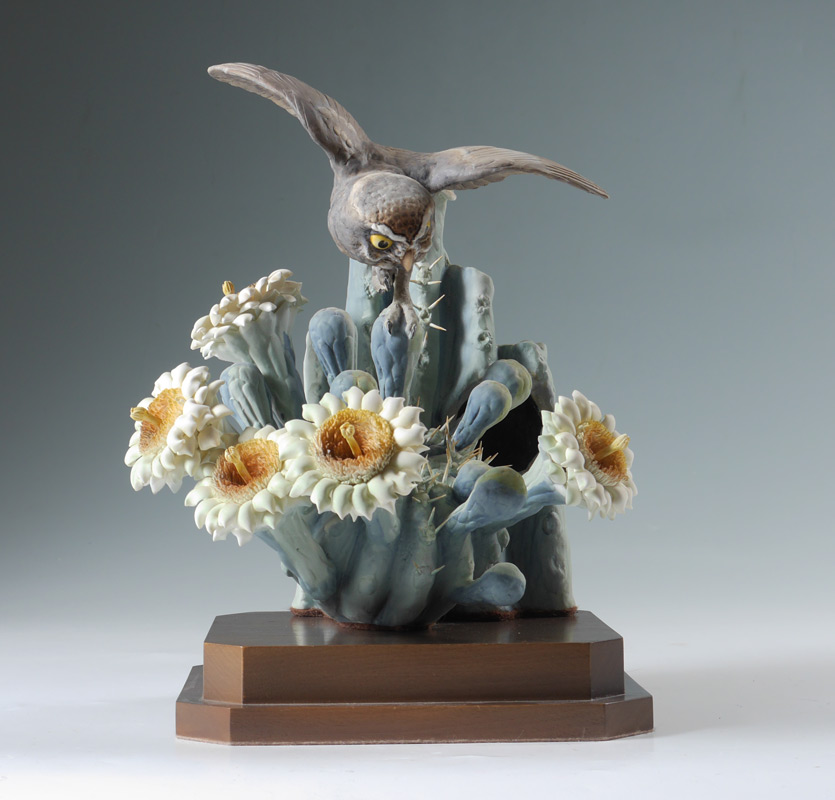 DOROTHY DOUGHTY ELF OWL PORCELAIN BIRD: Moonlight Elf Owl on Giant Saguaro Cactus, 11 1/2'' h. x 9 3/4'' x 8 1/2'', stand 2 3/4'' x 9'' x 7 1/2'', original packing box 14'' x 13'' x 12''.