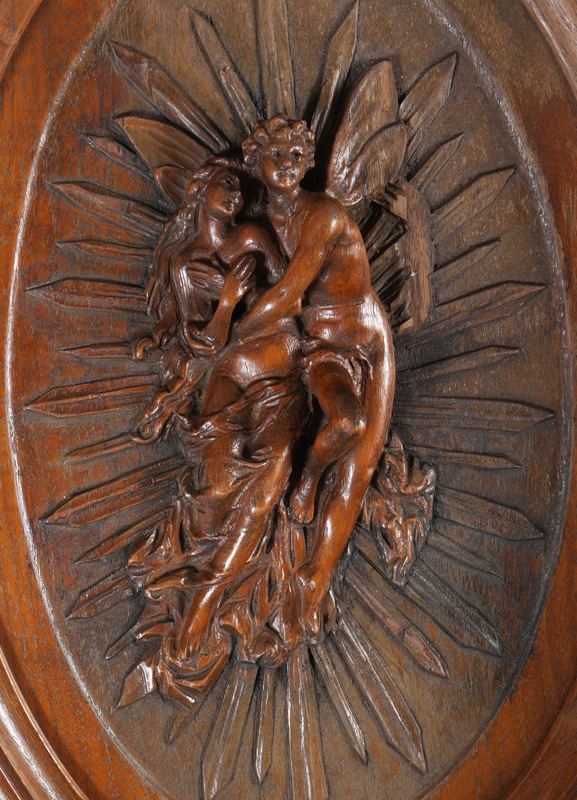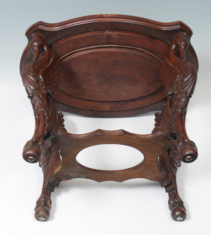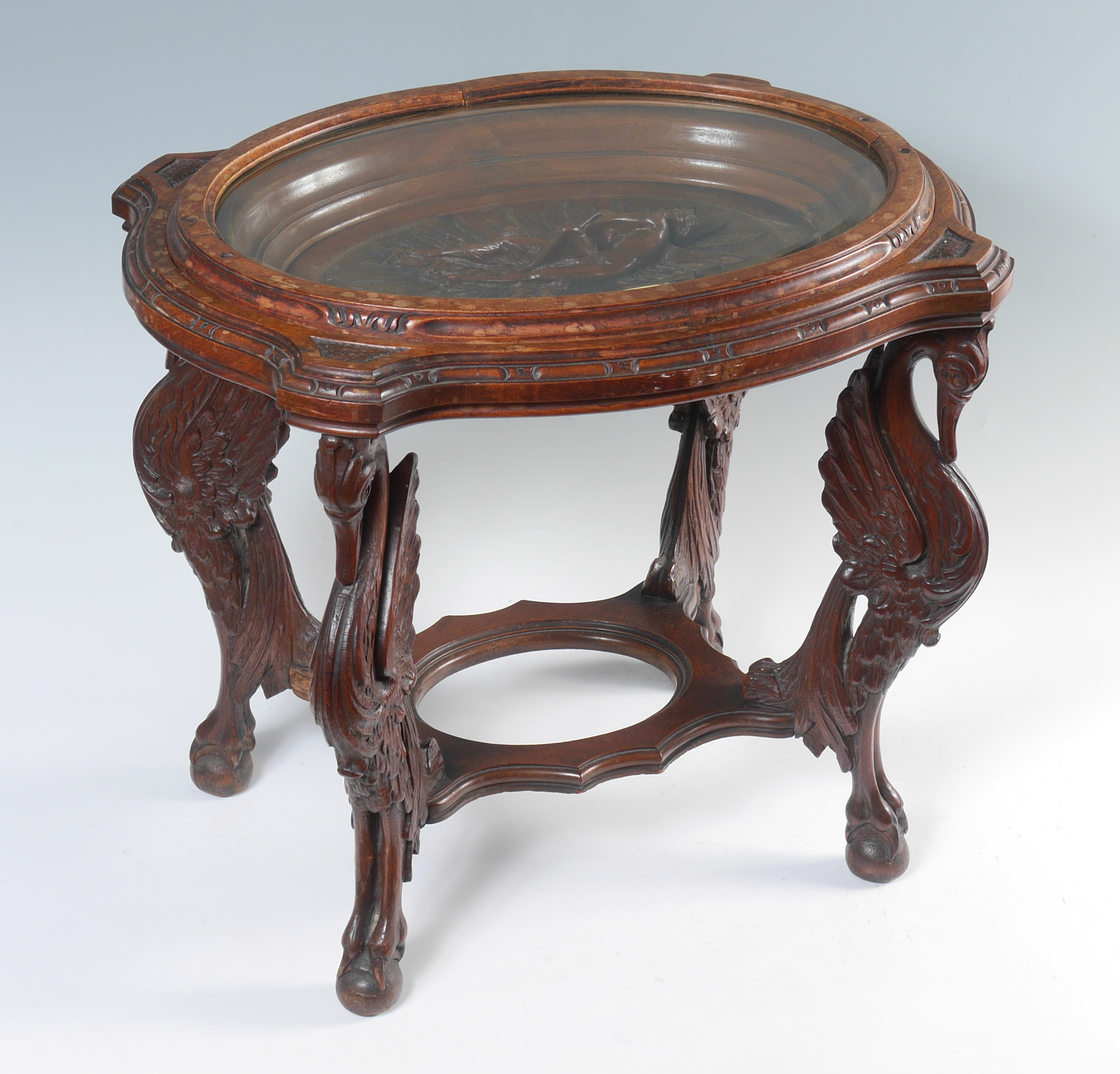 VICTORIAN CONTINENTAL RELIEF CARVED TEA TABLE: Oval glass tray over table top with carved relief figures lovers embraced with rays radiating behind. Shaped top, carved figural swan legs and feet, open shaped lower stretcher. Overall measures 21'' h. x 24'' x 19''.