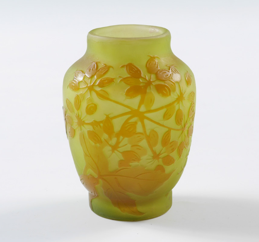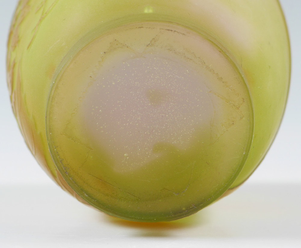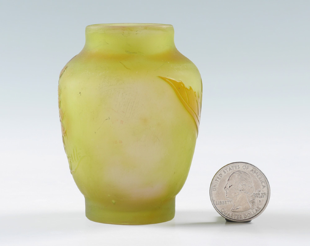 DIMINUTIVE SIGNED GALLE CAMEO GLASS VASE: Green ground, floral motif, signed Galle. 3'' h. x 2 1/4''.