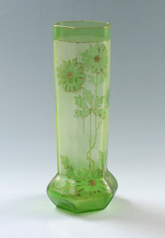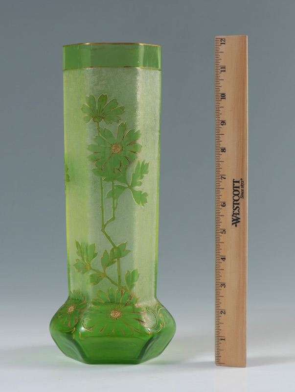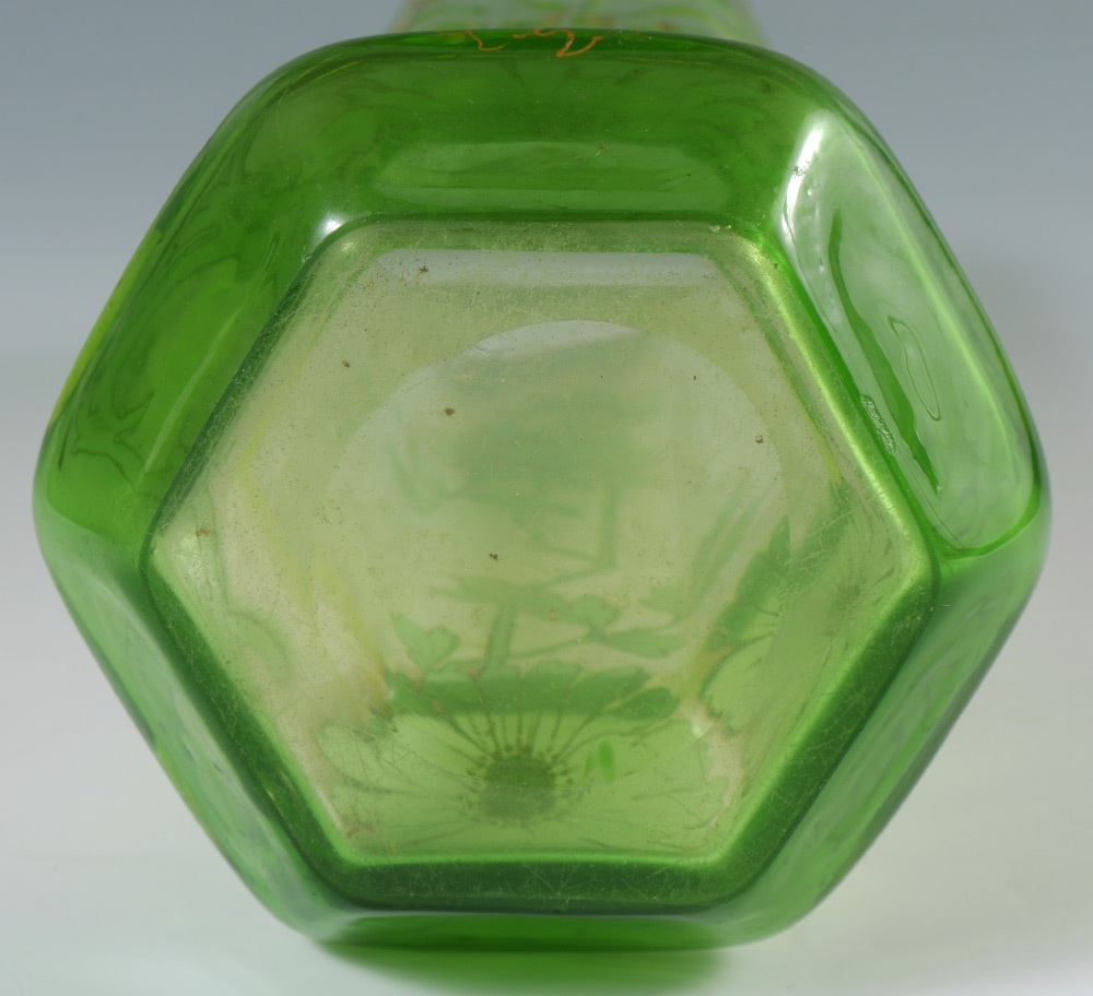 MONT JOYE QUALITY GREEN FLORAL CAMEO GLASS VASE: Hexagonal form green glass vase with cameo floral motifs, gilt accents, no visible markings. Overall measures 12'' h. x 5''.