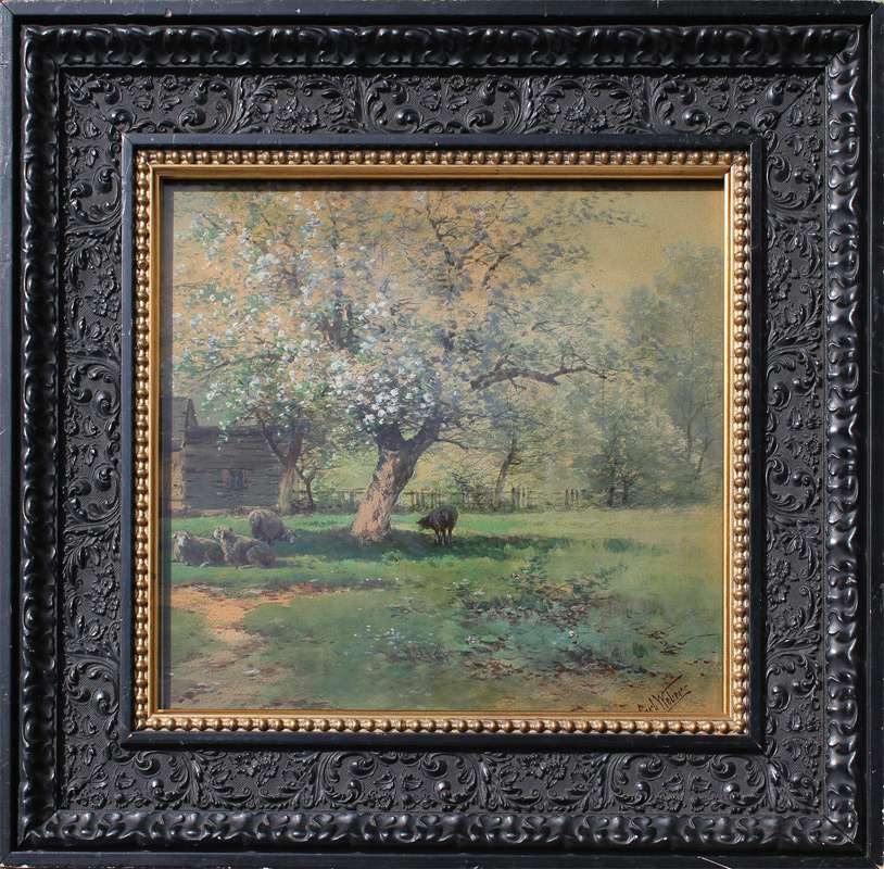 WEBER, Carl Philipp, (German, 1850-1921): Landscape Painting with Sheep, Watercolor, sight size 12.5'' x 14.25'', signed lower right, encased in ebonized gesso frame, 20.5'' x 22''. One of the key concepts demonstrated by Weber in this painting and by other 19th century landscape artists is where an area of the painting is highlighted, almost divinely. It reflects the concept of worshipping God through nature.