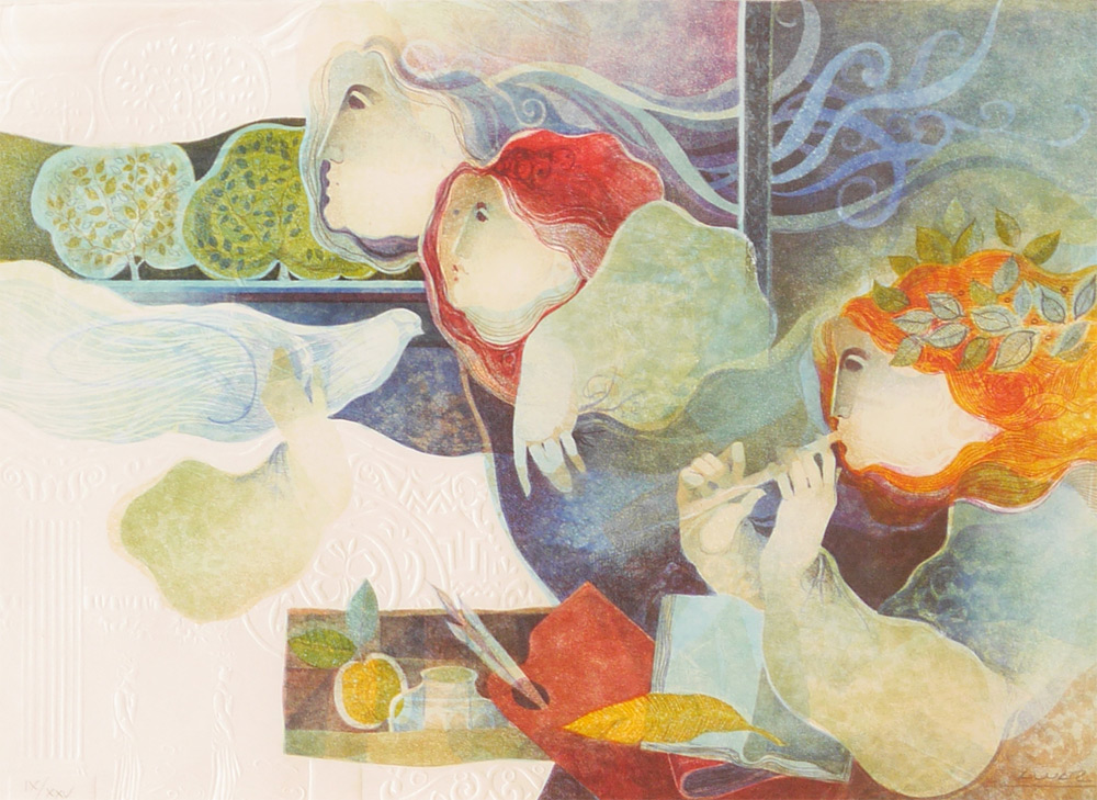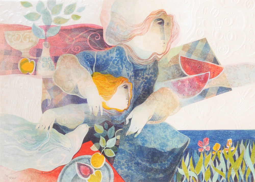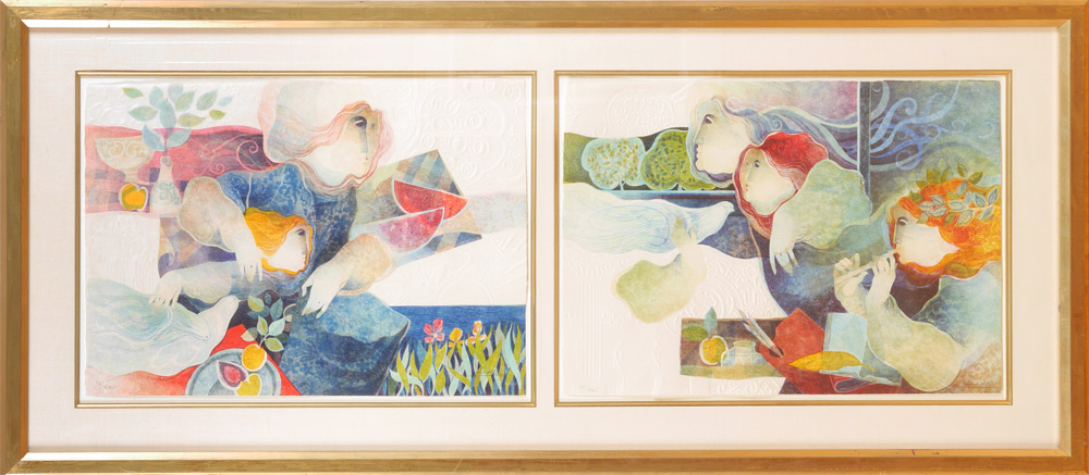 ALVAR, Sunol, (Spanish, born 1935): 2 Scenes sold as a set Depicting Families with Children and Animals. Each print measures approximately 17.75'' x 24.75. Both signed and numbered IX of XXV, all encased in a single frame, 27.5'' x 60''.