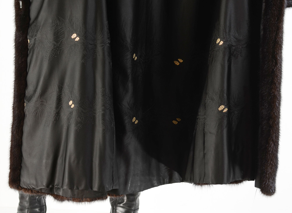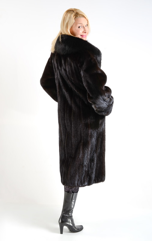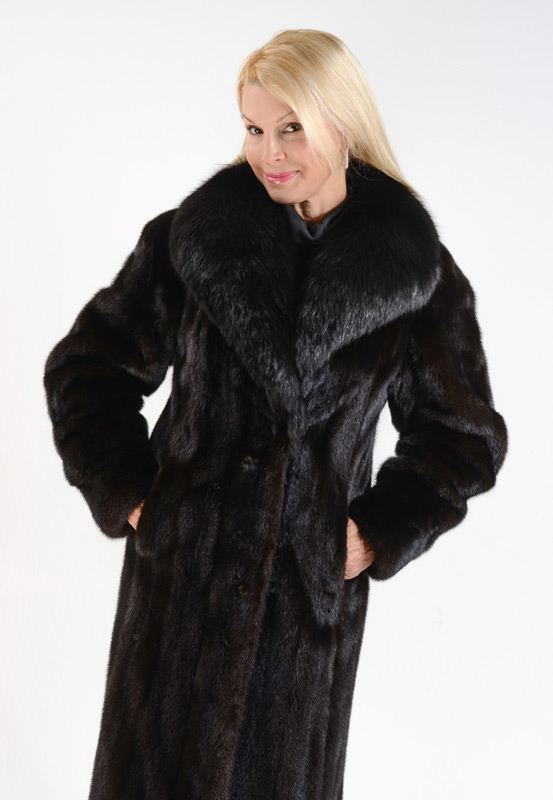 BLACK MINK AND FOX FUR COAT: Full length black mink coat with s black fox collar. Measures approx. 40'' collar to hem, 17'' shoulder to shoulder and 24'' shoulder to cuff.