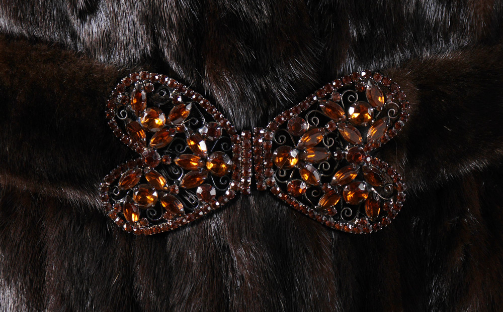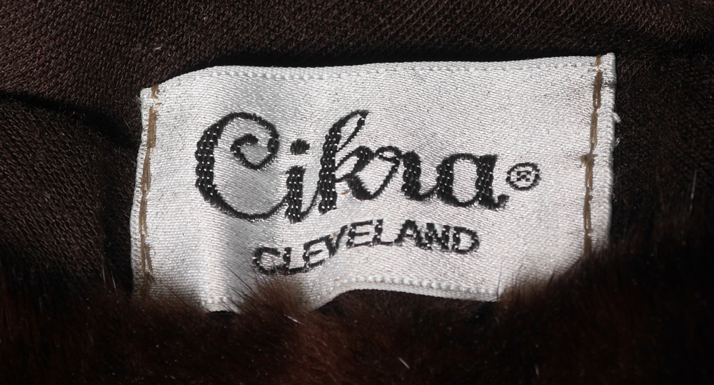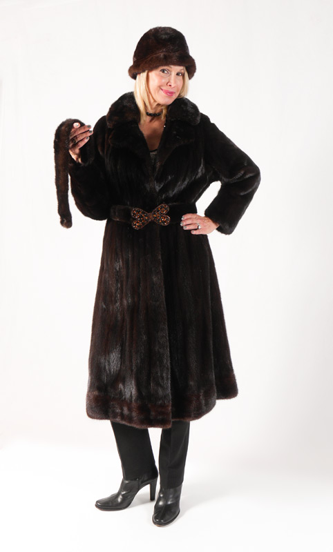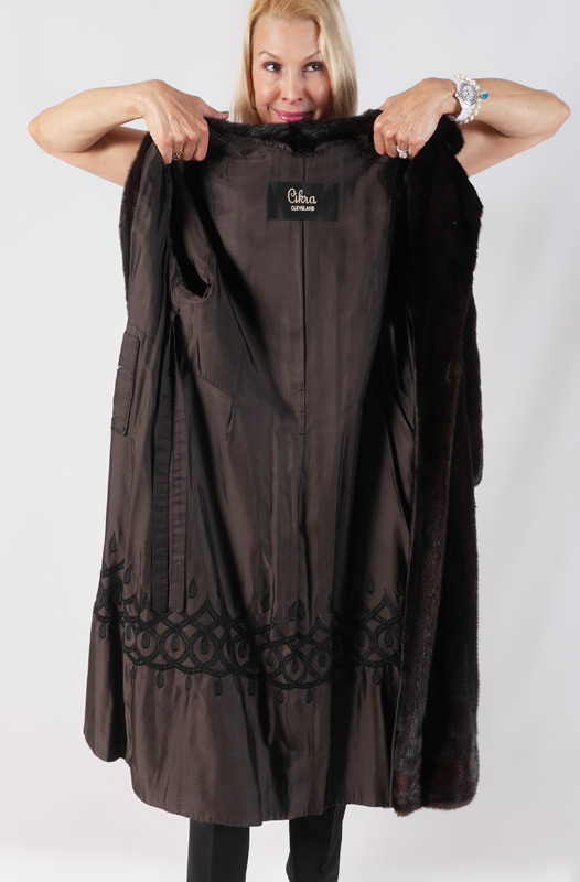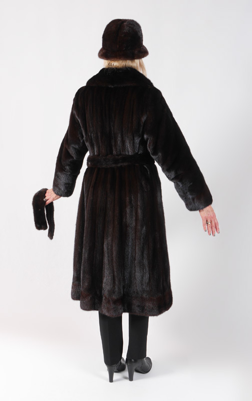 FULL LENGTH MINK FUR COAT WITH HAT: Deepest brown/black fur, sold with butterfly rhinestone belt and hat. Cikra of Cleveland label. Measures approx. 45'' collar to hem, 17'' shoulder to shoulder and 22'' shoulder to cuff.