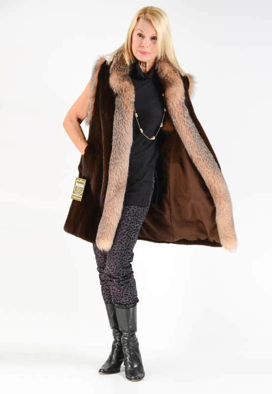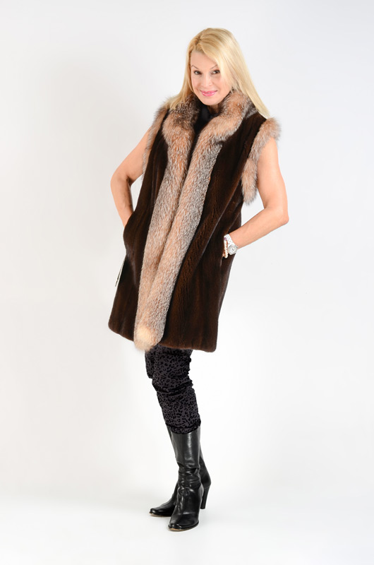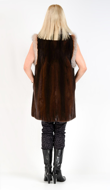 MAHOGANY MINK AND CRYSTAL FOX VEST: 3/4 length mink vest with fox trim, velvet lined slit pockets. Measures approx. 35'' collar to hem, 16'' shoulder to shoulder.