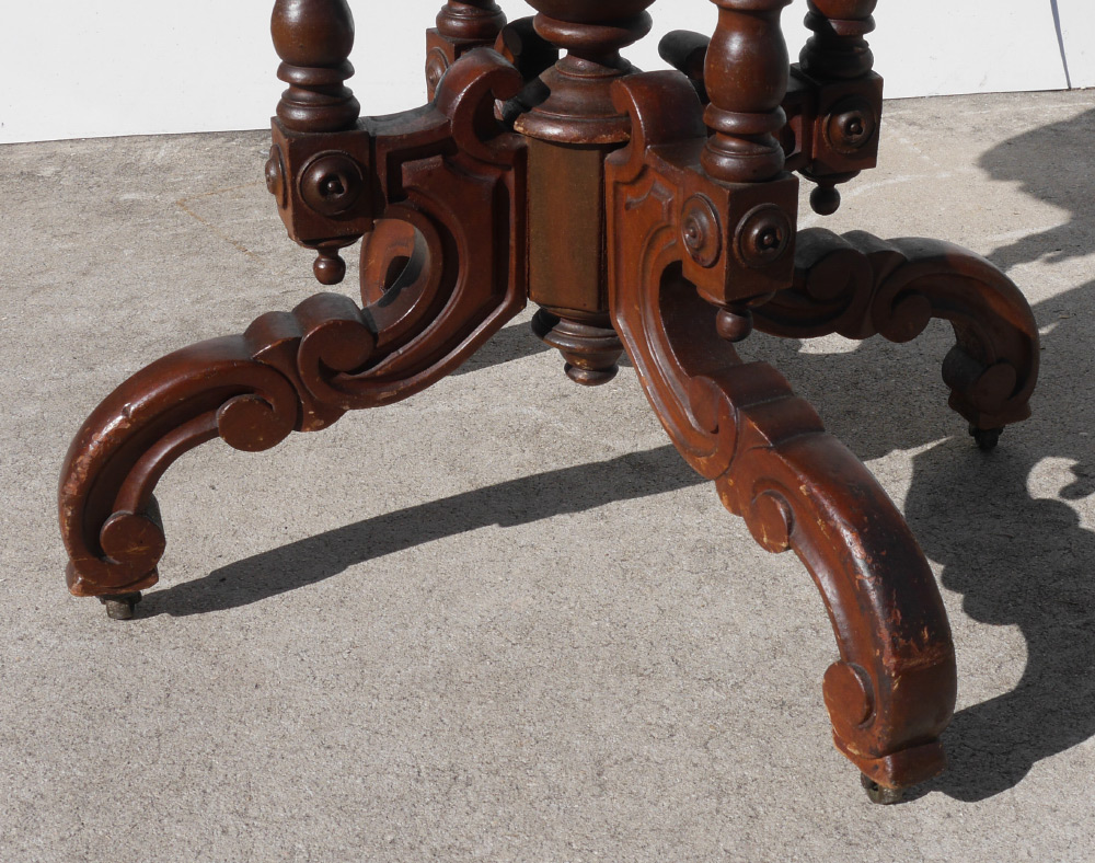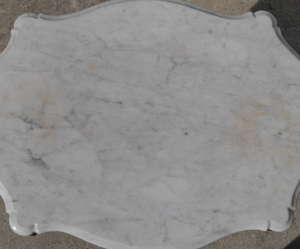 SHAPED WHITE MARBLE TOP VICTORIAN SIDE TABLE: White beveled marble turtle top table, carved and shaped skirt, turned supports, splayed feet. Measures approx. 28 1/2'' tall x 30'' x 22''.