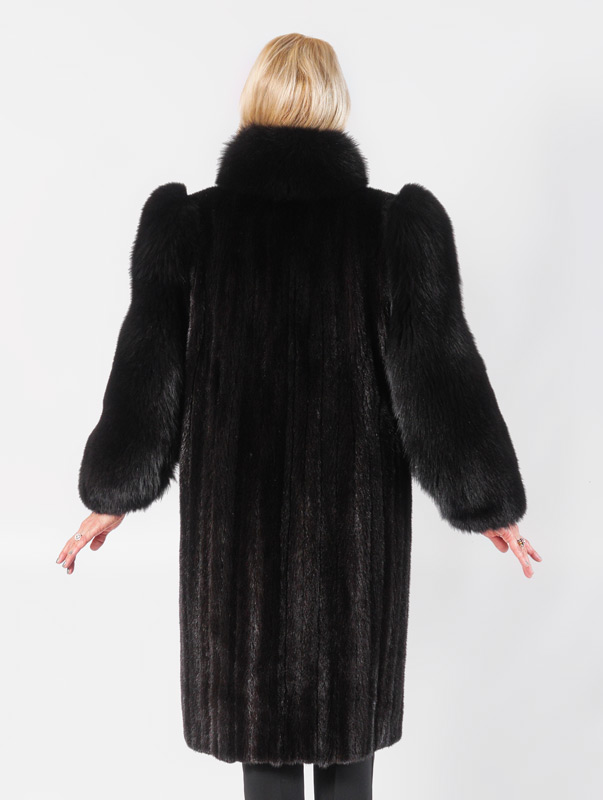 FULL LENGTH BLACK MINK AND FOX FUR COAT: Mink coat with fox trim, stand up collar and sleeves. Maintained in cold storage. Measures approx. 40'' collar to hem, 18'' shoulder to shoulder and 23'' shoulder to sleeve.
