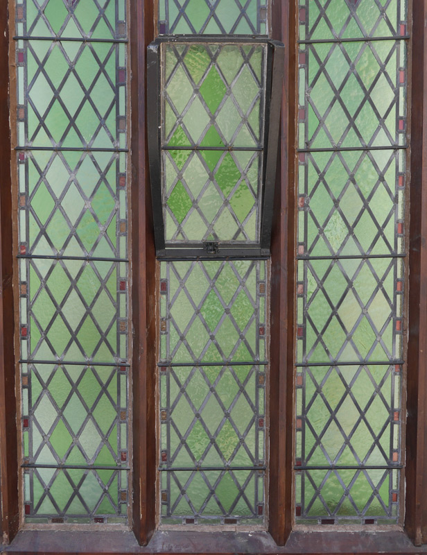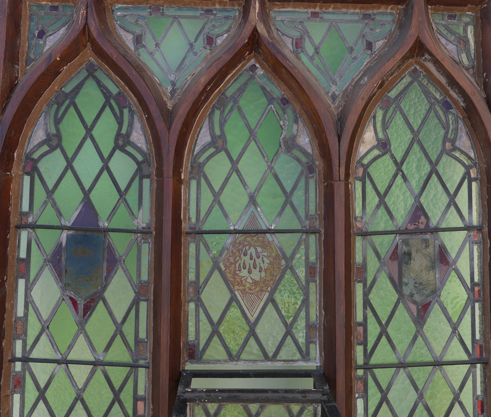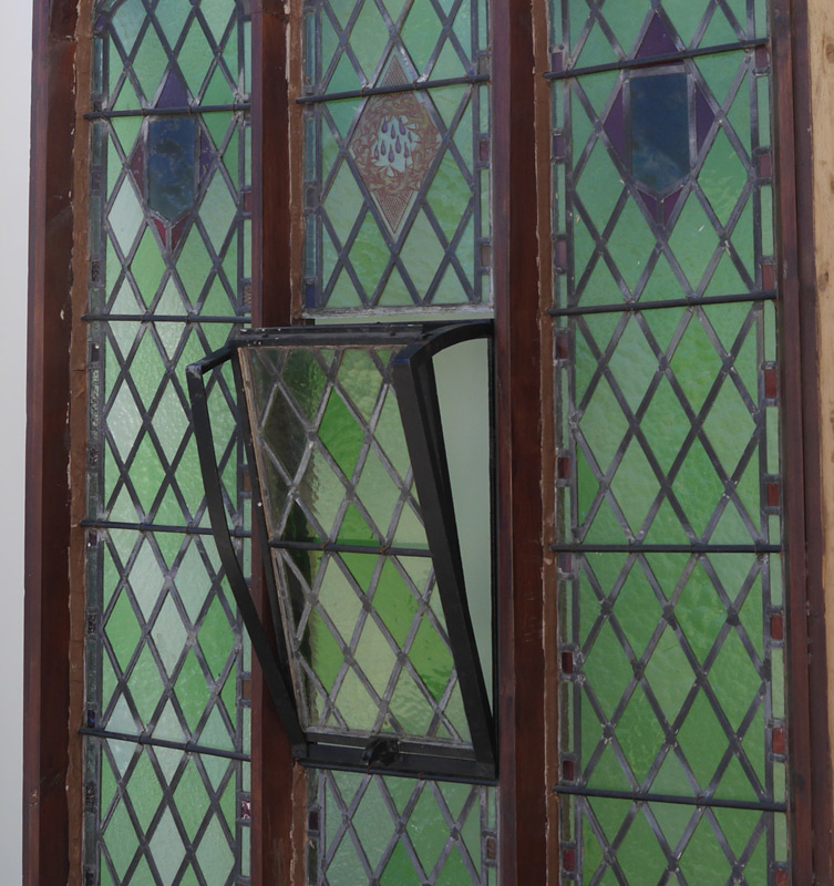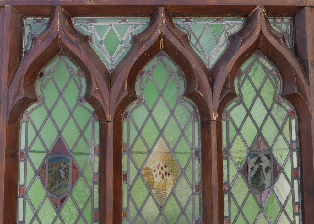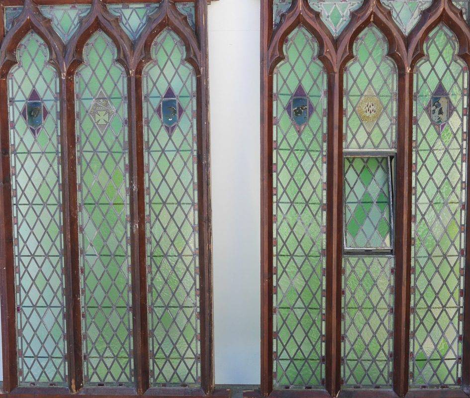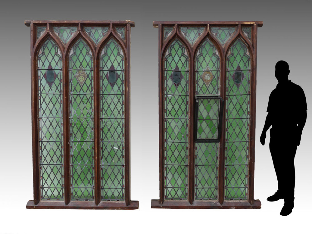 2 LARGE ENGLISH STAINED GLASS CHURCH PANELS: Each panel with 3 arched sections, assorted glass, medallions, one with tilt out window, approx. 94 1/2'' h. x 57'' x 5 1/2''.