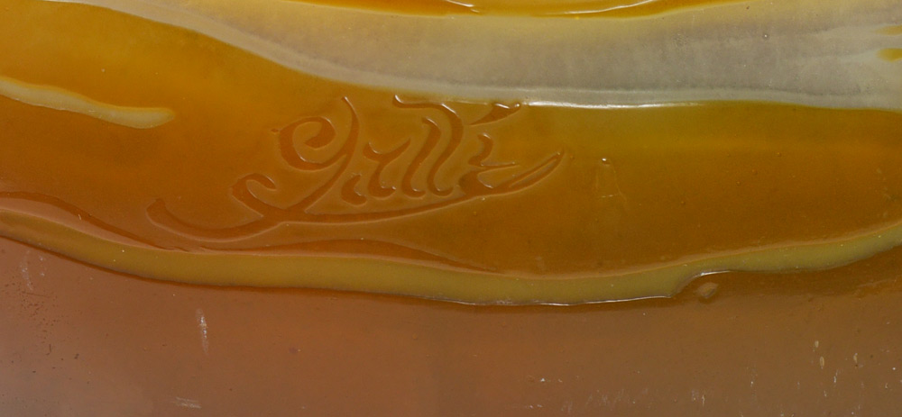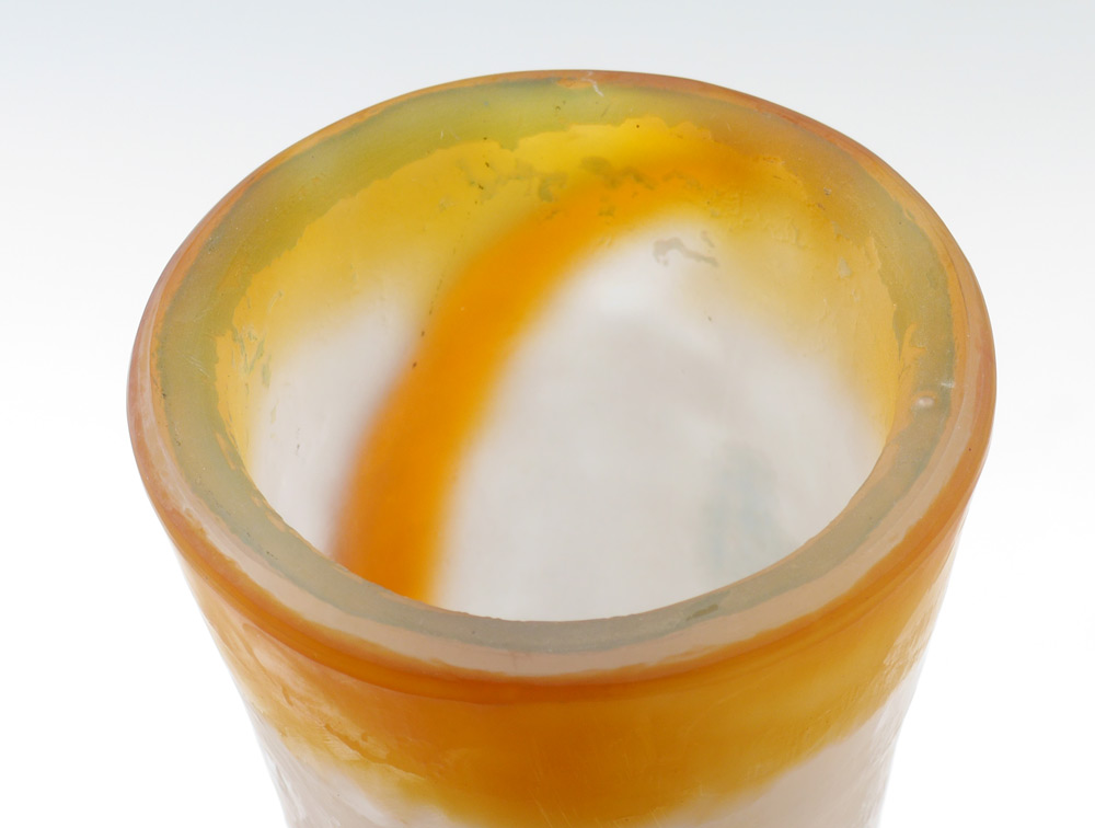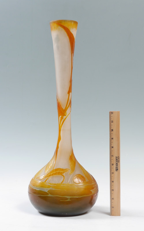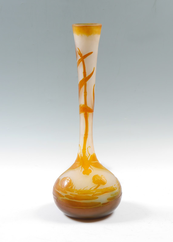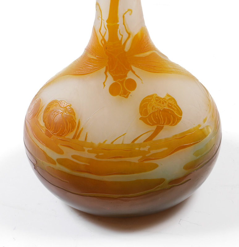 LARGE DRAGONFLY CAMEO GLASS VASE: In the style of Galle, unsigned, flared rim, tapered neck, bulbous body. Amber to frosted clear with dragonfly, pond and water lilies motif. Overall measures 23'' h. x 8 1/4''