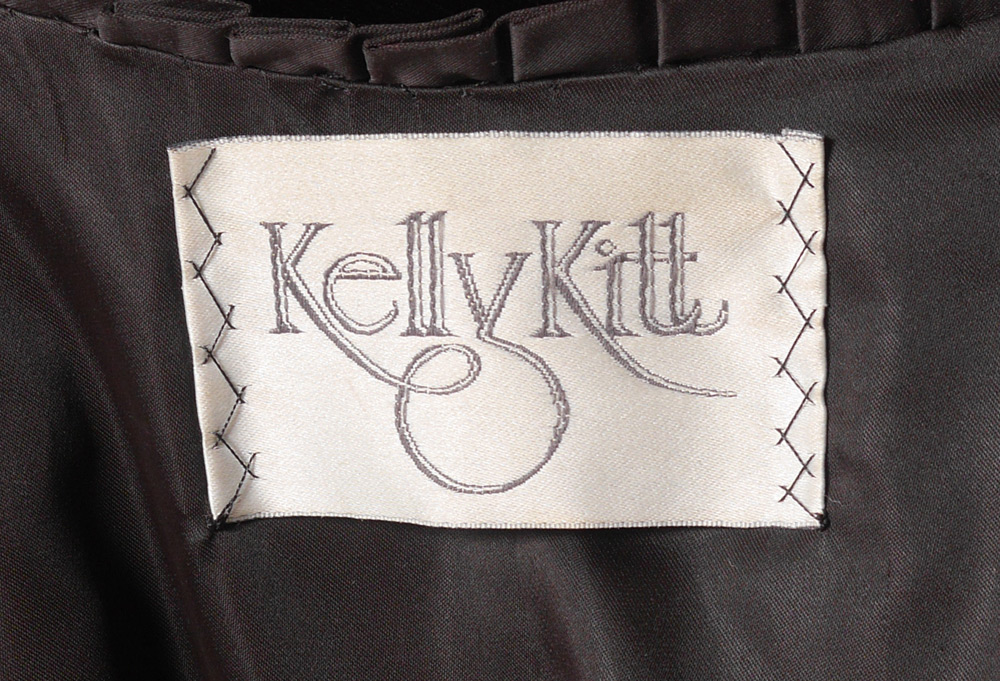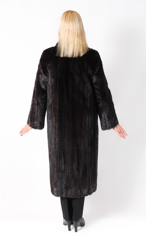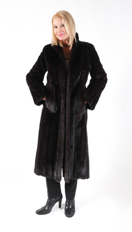 FULL LENGTH BLACK MINK COAT: Luxurious black mink coat having a stand up collar and narrow lapel. Slightly bell sleeves. Kelly Kitt label. Measures approx. 45'' collar to cuff, 18'' shoulder to shoulder and 24'' shoulder to sleeve.
