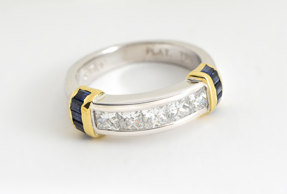 SCOTT KAY PLATINUM DIAMOND AND SAPPHIRE BAND / RING: Designer ring with 5 square Princess cut, channel set diamonds totaling approx. 1.00 Ct., averaging VS in clarity and G-H color. 10 baguette sapphires, approx. .50 Ctw. are set in 18K yellow gold. Signed Scott Kay. Size 4. Weight 5.9 grams. Sold with 2014 Atlanta Gemological GIA graduate's appraisal for $4,500.