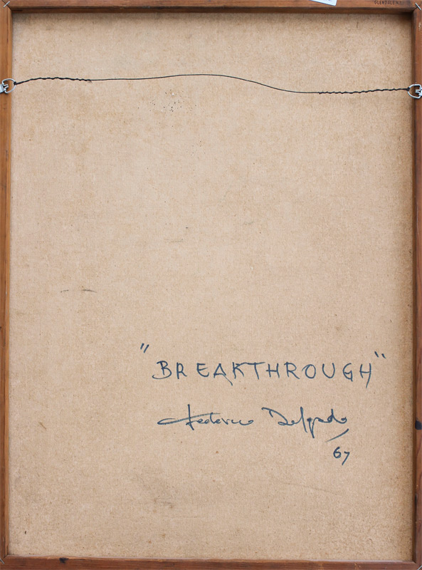 DELGADO, Federico, (1929-): ''Breakthrough'', Abstract Composition, Oil/Canvas, 28'' x 22'', signed lower right and dated '67, also signed and titled verso with date, framed 29.5'' x 23.5''.