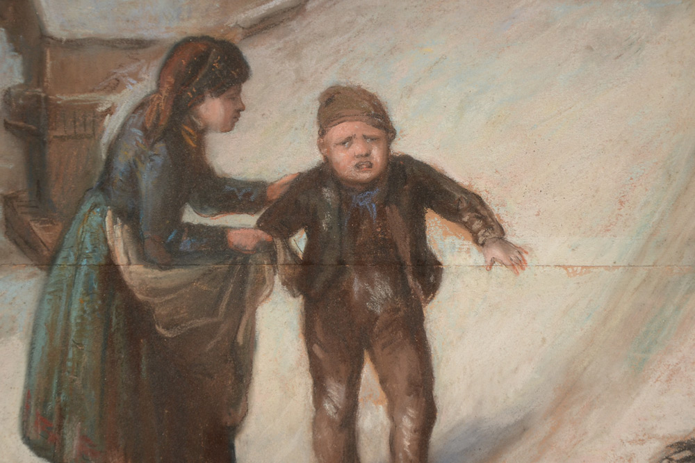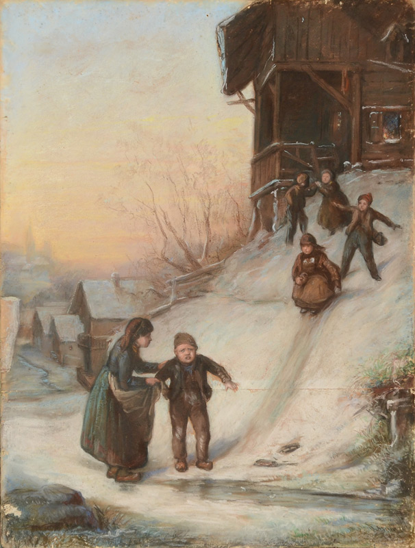 EARLY PASTEL OF SLEDDERS: Illegibly signed lower right and dated 1839, Pastel on Canvas, 25 1/2'' x 19 3/4'', fine period frame, 36'' x 25''.