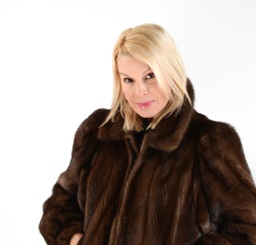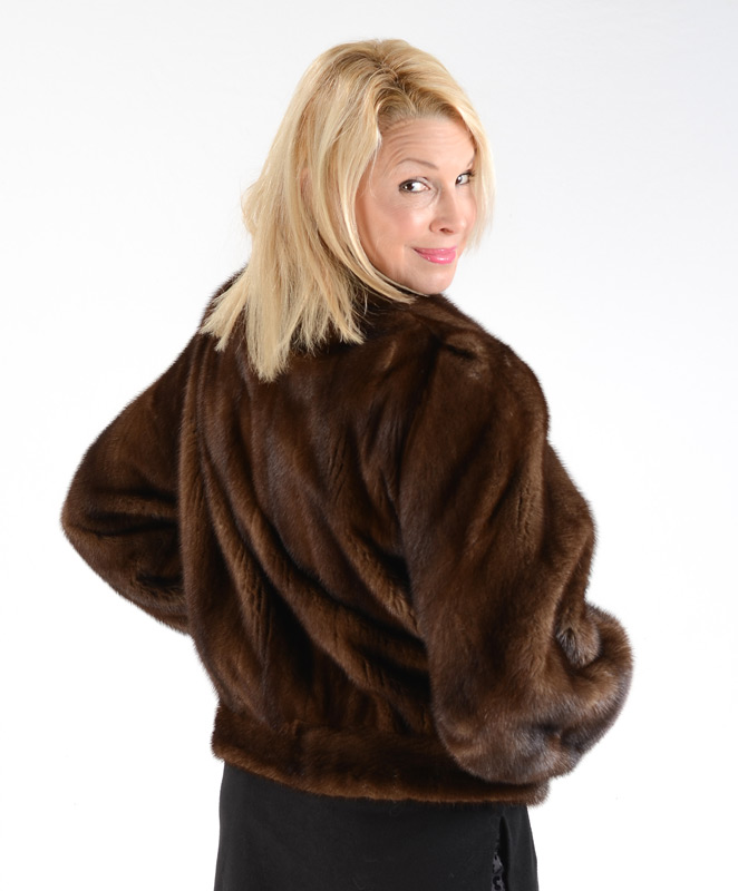 MINK BOMBER STYLE FUR JACKET: Zipper front and elastic stretch fitted cuffs. Measures approx. 28'' collar to hem, 18'' shoulder to shoulder, and 24'' shoulder to shoulder.