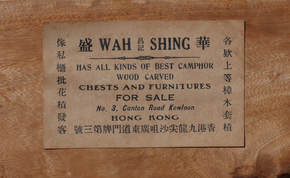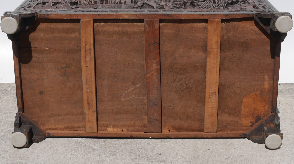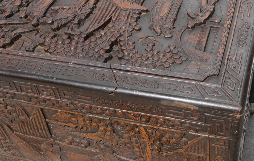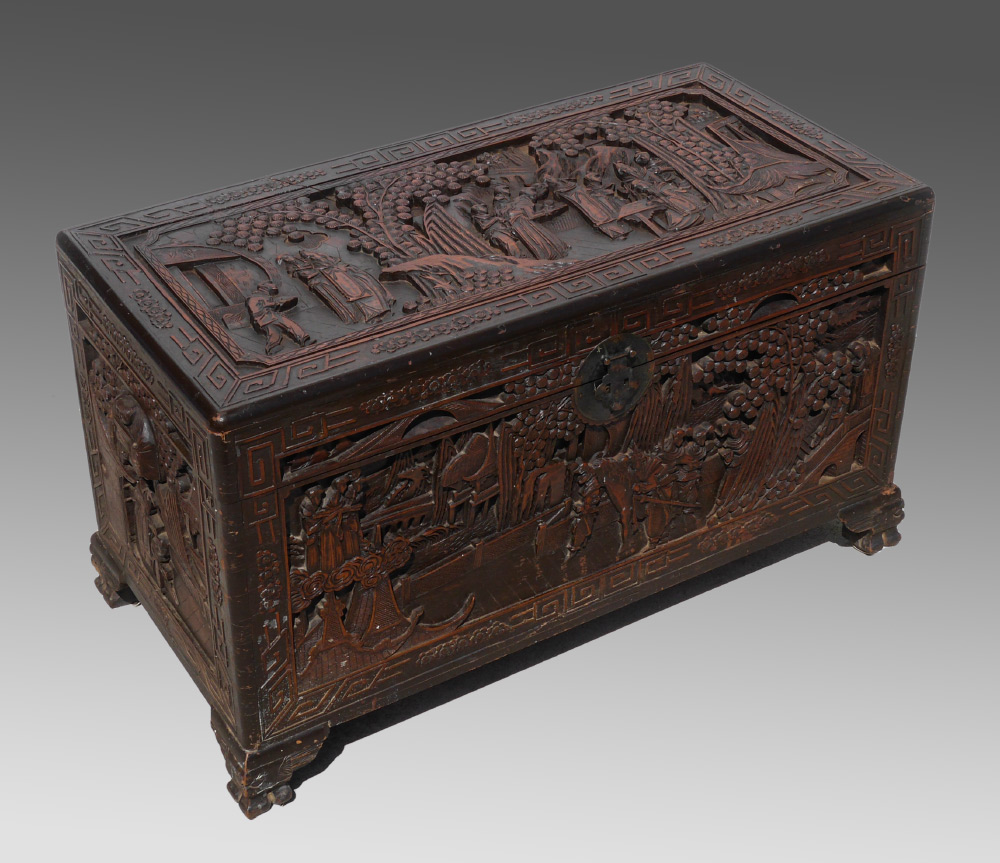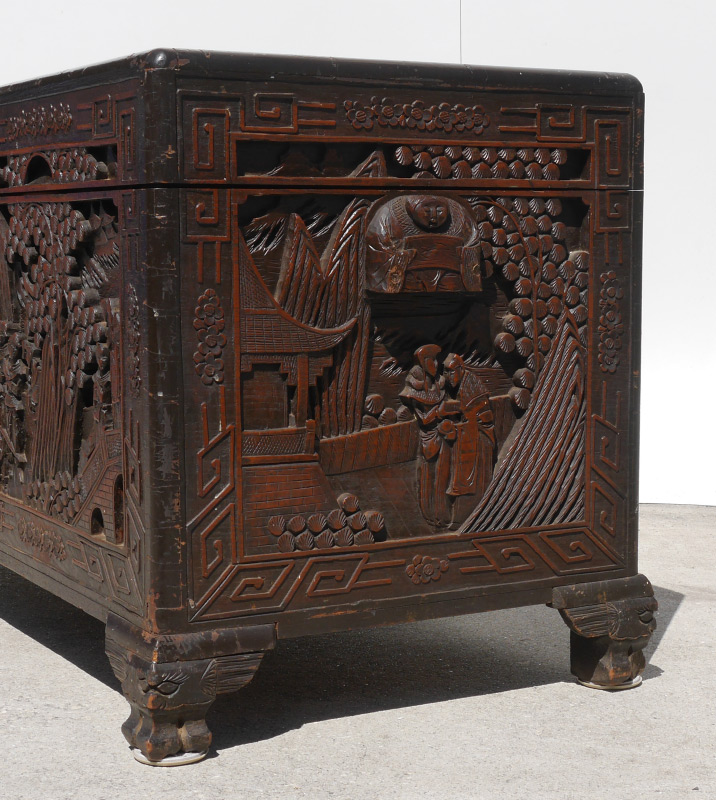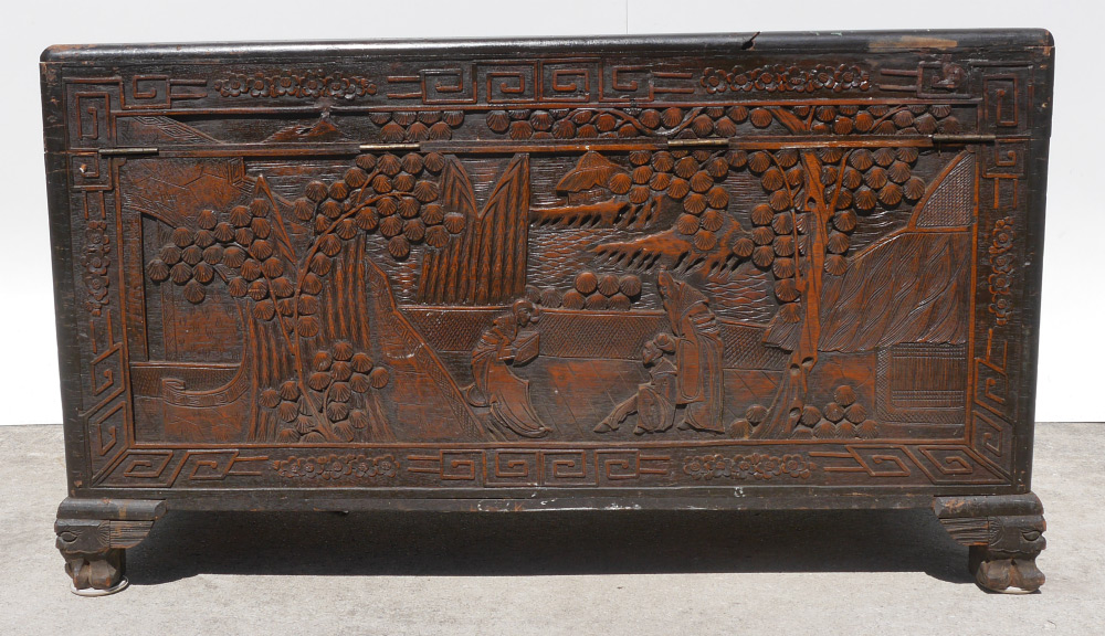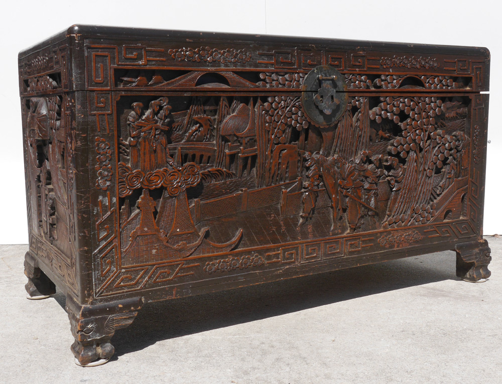 CARVED CHINESE CAMPHOR CHEST / TRUNK: Carved all over with figures in outdoor genre scenes, hinged lid, wood handles. 25'' h. x 44 1/2'' x 21 1/2''.