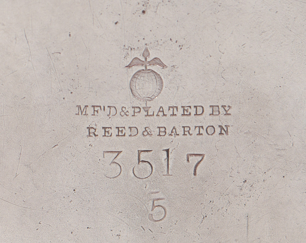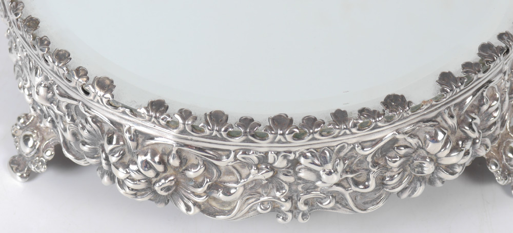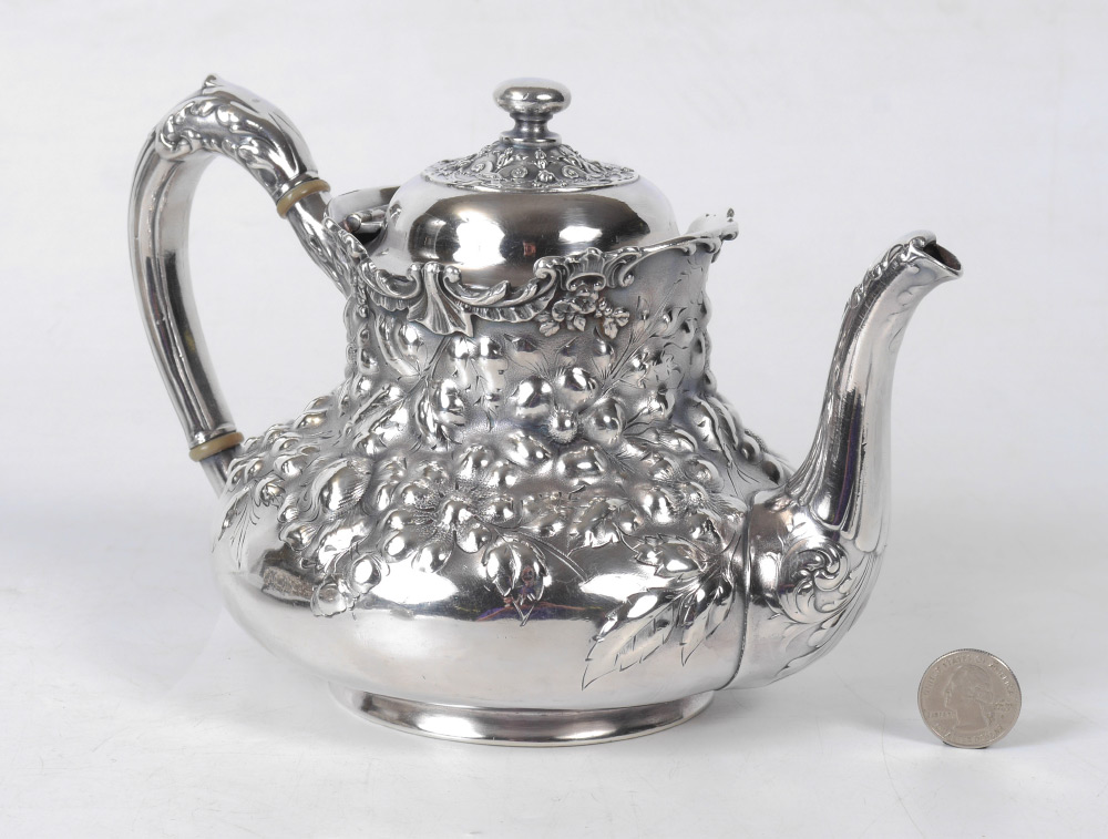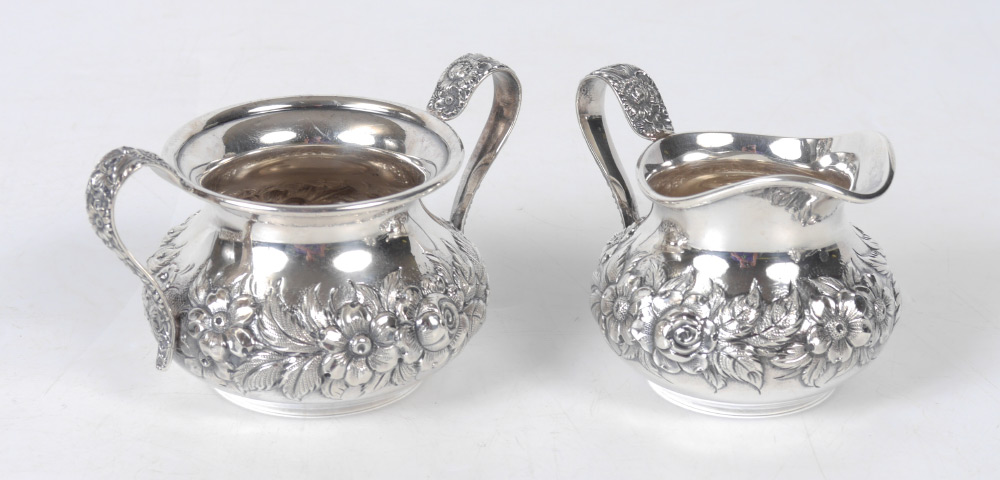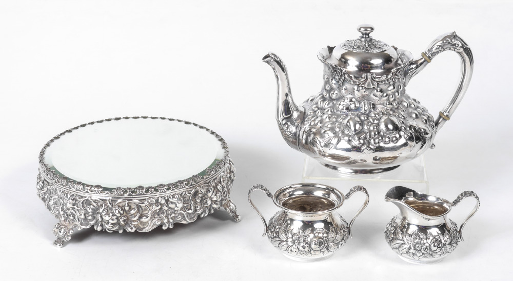 KIRK & SON STERLING REPOUSSE SUGAR AND CREAMER: 4 pieces total to include 1-2) S. Kirk & Son floral repousse diminutive open creamer 2 3/4'' h. x 3 3/4'' and open sugar 2 3/4'' x 4 3/4''. Sold with 3) Reed & Barton silverplate repousse teapot, 5 3/4'' h. x 8 3/4''. 4) Unmarked repousse silverplate mirrored plateau, 2 3/4'' x 9''. Approx. 8.9 troy oz.