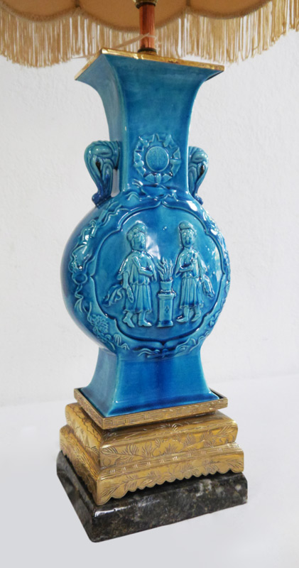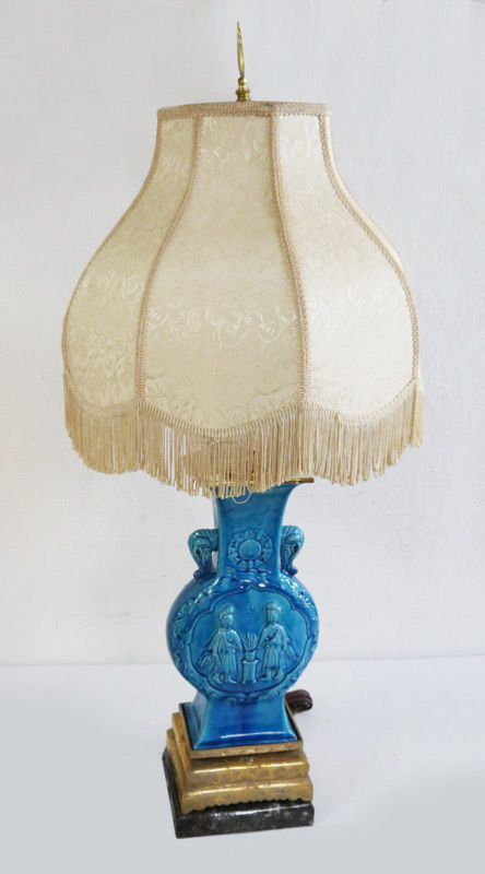 CHINESE BLUE GLAZE PORCELAIN LAMP: Crackle blue glaze porcelain body with figures in medallions, figural handles. Stepped brass base over faux stone base. Single socket fixture, 30'' h. x 7'' x 5 1/2''. Sold with fringed shade, 12'' h. excluding fringe x 15 1/2''.