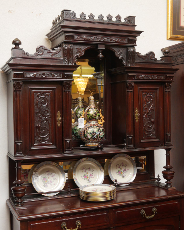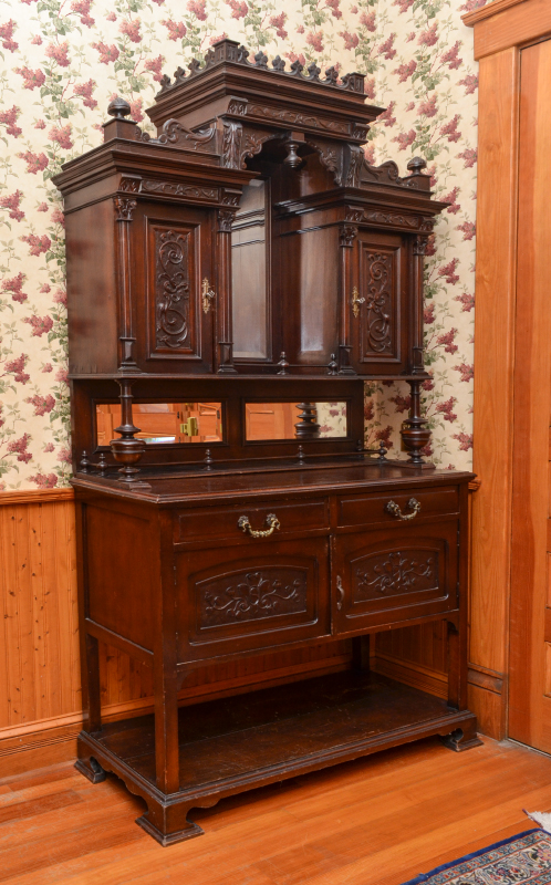 EDWARDIAN CARVED STEP BACK COURT CUPBOARD: 2 level carved crest, central beveled glass mirror over shelf surmounted by carved doors, turned supports, mirrored backsplash. Base with 2 drawers over 2 carved doors over open shelf for storage, shaped feet. Overall measures 92'' h. x 51 1/4'' x 18 1/2''.