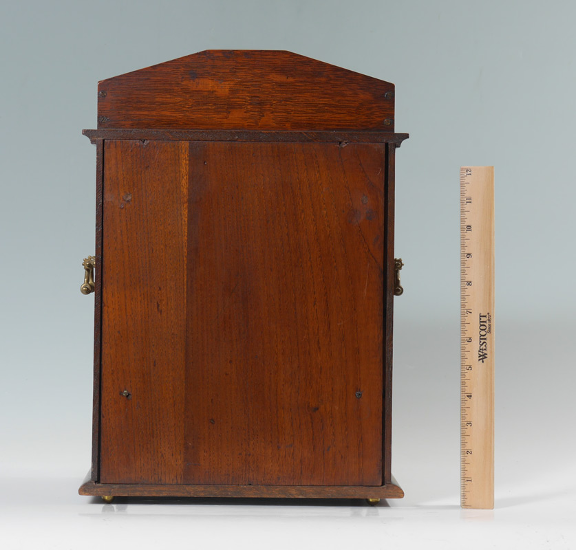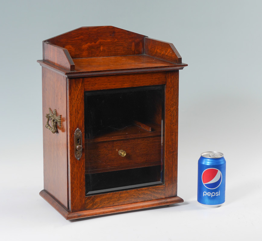 OAK JEWELRY DISPLAY BOX: Oak case with beveled glass locking front door, handles with side, interior with single drawer and display shelf. Measures 16 1/4'' h. x 11 1/2'' x 7 1/2''.