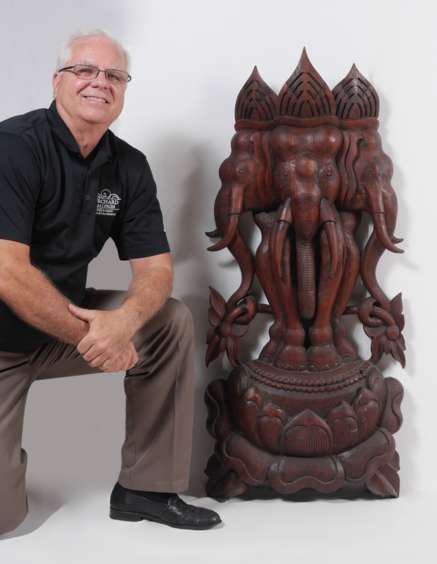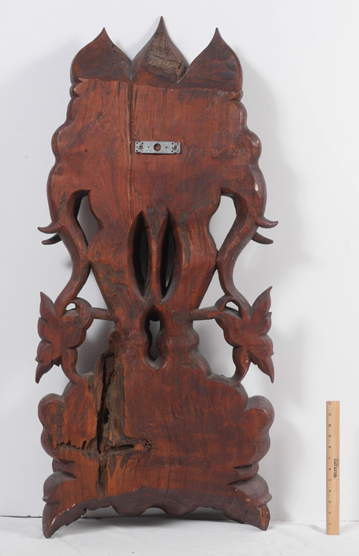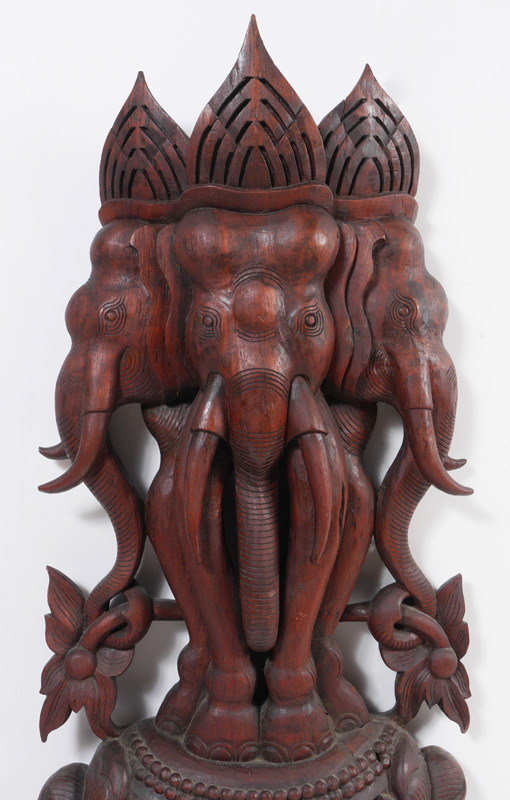 4' TALL CARVED TRIMUKHA GANESH FIGURE: Southeast Asian carved wall hanging three headed figure of Ganesha standing atop a lotus blossom. Overall measures 48 1/2'' h. x 22'' x 6''.