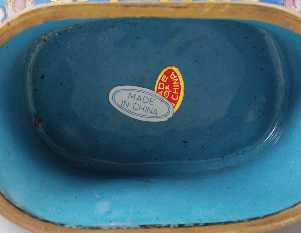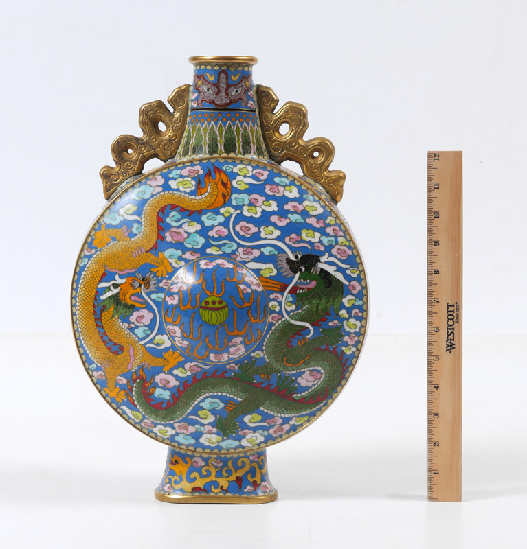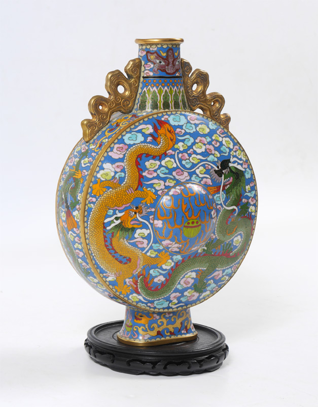 CHINESE CLOISONNE MOON VASE: Dragon in clouds motifs on blue ground, center convex button on either side, brass handles, Made in China stickers on base. 15 1/2'' h. x 10'', wood stand 1 1/2'' h. x 7 1/2''