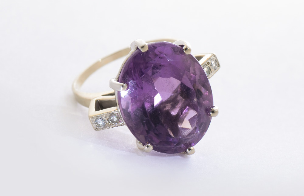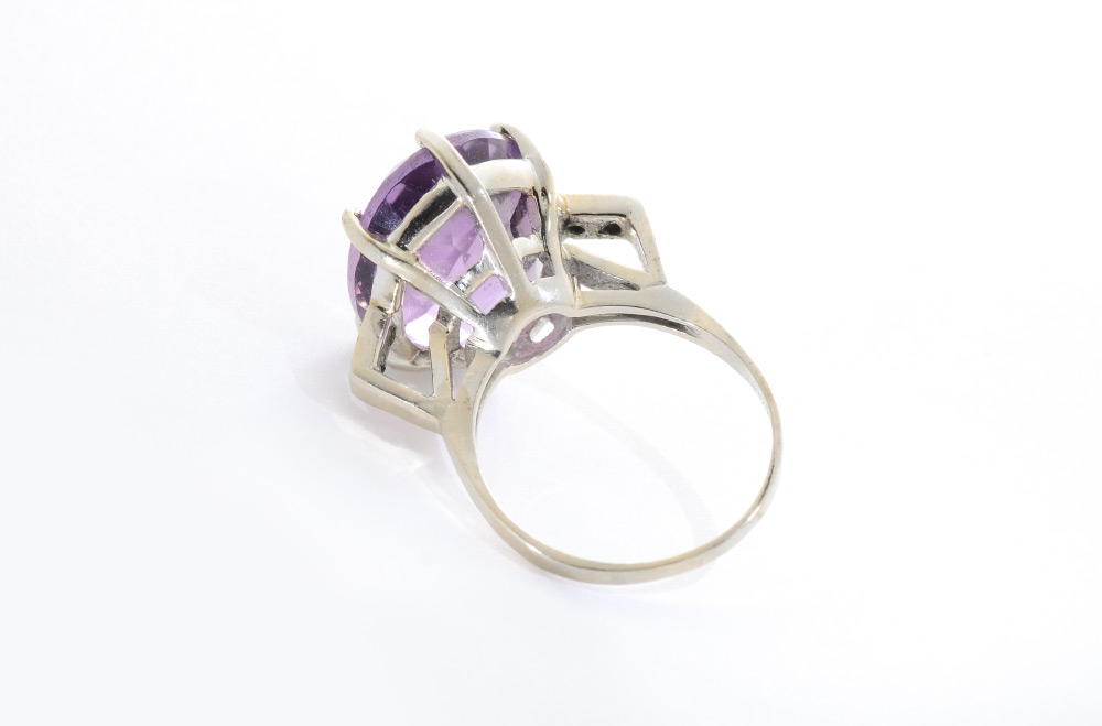 AMETHYST & DIAMOND RING: 14K white gold ring centers one oval mixed cut, 15.85 Ct amethyst, rated VVS in clarity (Type I), P in Hue, 3 in Tone and 2-3 in Saturation. The 4 round brilliant cut diamonds total approx. .12 Ct., rated VS in clarity and G-H in color. The amethyst and diamonds are prong set. Mounting weight approx. 5.7 grams. Size: 9.