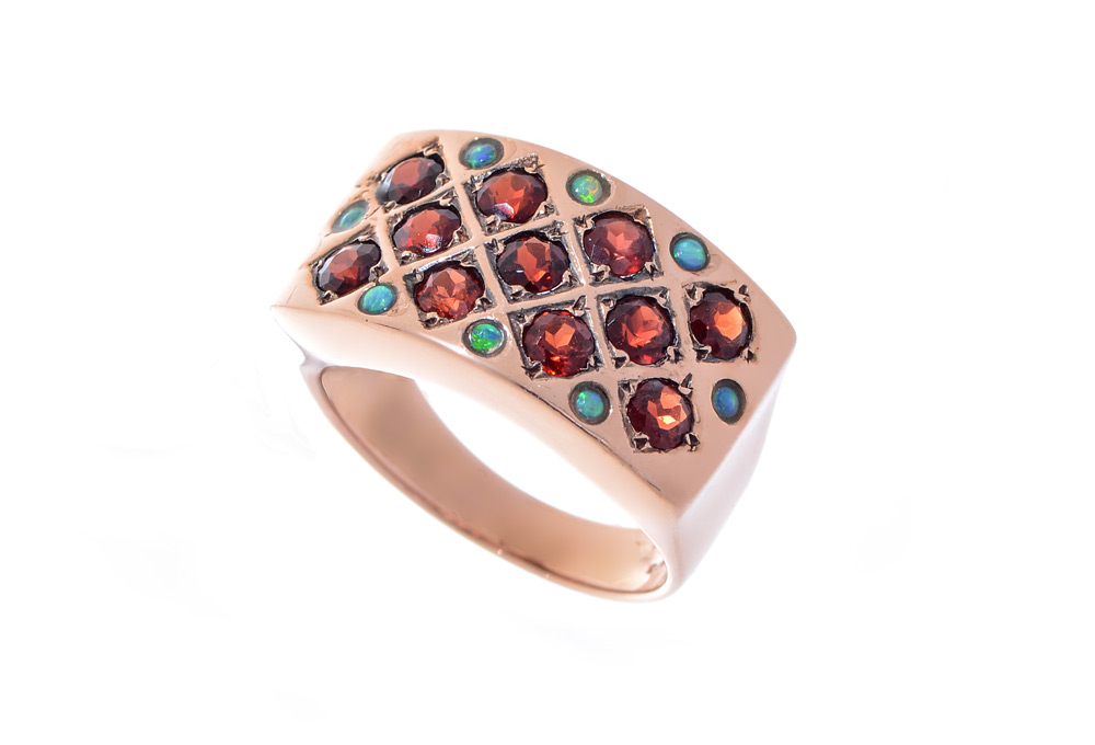 GARNET & OPAL RING: 14K yellow gold ring with 11 round faceted garnets totaling approx. 1.65 Ct. and 8 round cabochon opals measuring 1.00 mm. The garnets are prong et. The opals are gypsy set. Weight: 9.1 grams. Size: 7.5