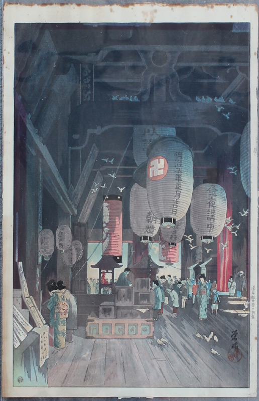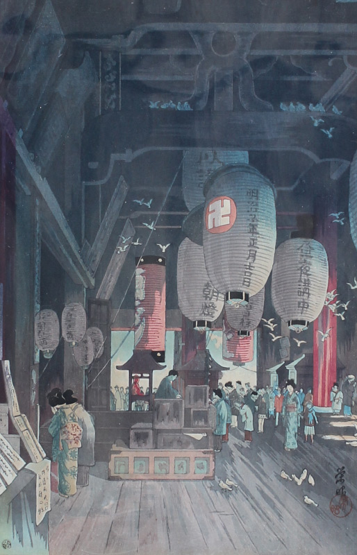 EISHO NARAZAKI WOODBLOCK: Inside Asakusa Kannon Temple, 6mm 1932 seal ('46-'57), 13.5'' x 9'', unframed.