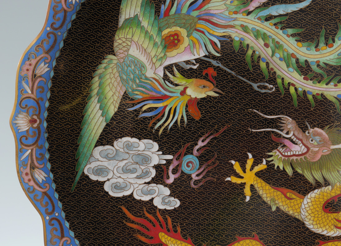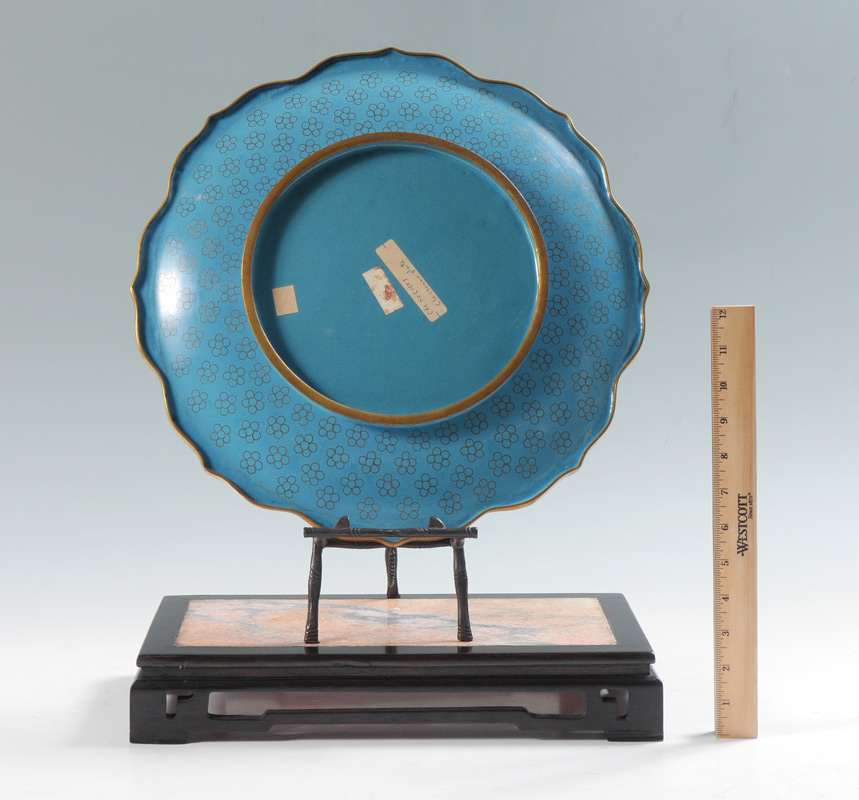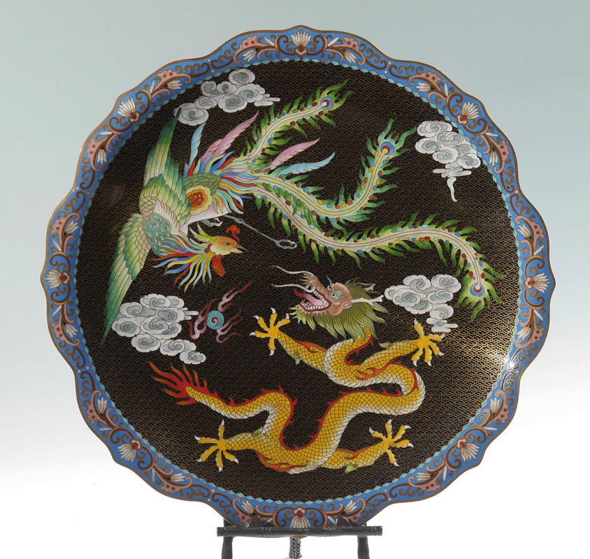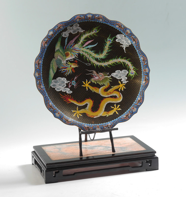 CHINESE DRAGON CLOISONNE CHARGER: Scalloped edge with blue border, black ground with dragon and phoenix in clouds, 15 1/2'' dia. Sold with a brass bamboo style stand, 14'' h. x 5'' x 7 1/2'' and a marble inset carved wood base 2 1/2'' h. x 15'' x 9''.