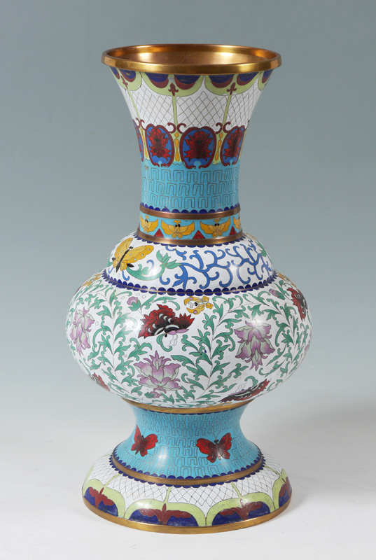 LARGE CHINESE CLOISONNE VASE: Flared rim, stepped bulbous body, flared foot. White ground with floral and butterfly motifs, 20'' h. x 10 1/2''.