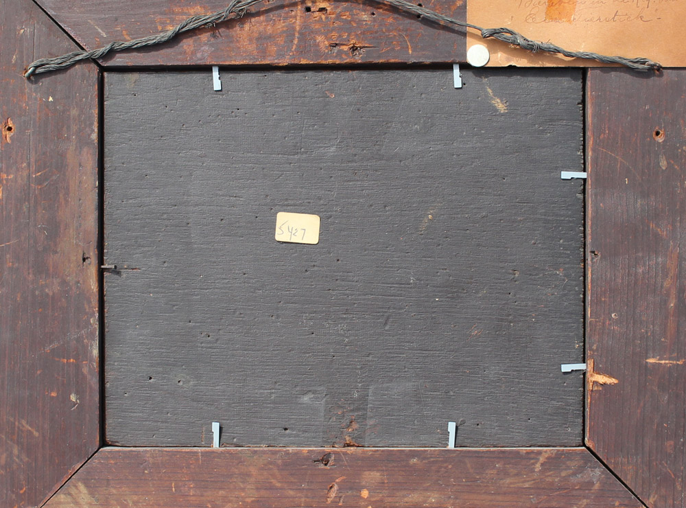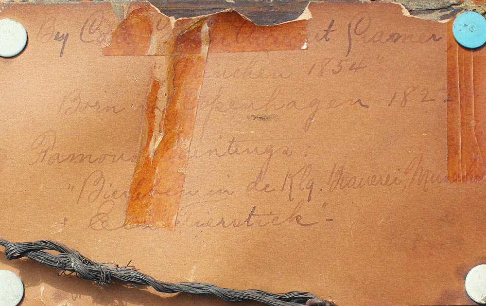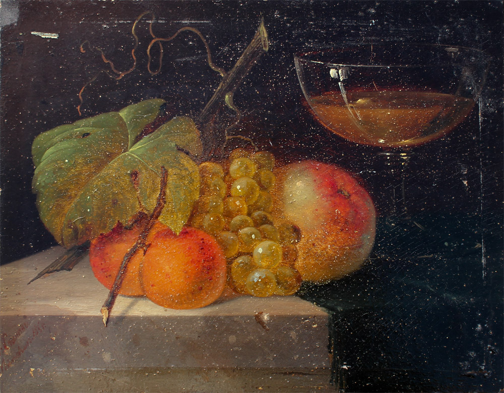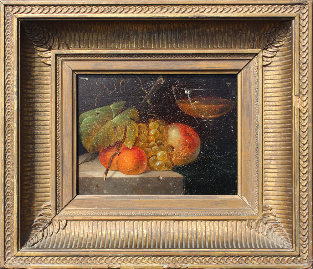 CREMER, Carl Cesar Adelbert, (Danish, 1822-1889): Still Life with Grapes, Peaches, Apple and Wine, Oil/Board, 6.5'' x 8.75'', framed, 12.5'' x 14.5'', old label affixed verso.