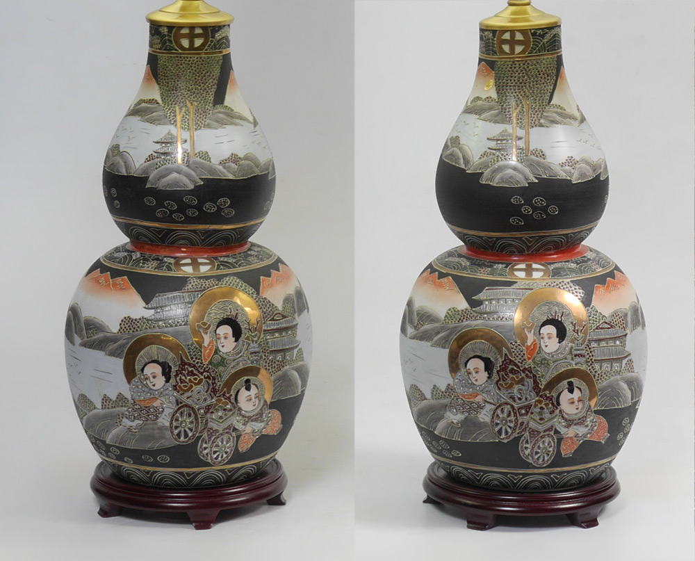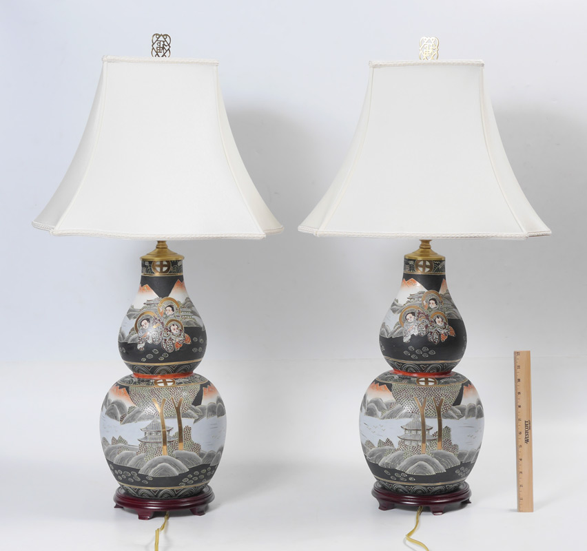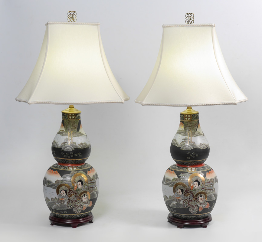 PAIR JAPANESE SATSUMA LAMPS: Double gourd form vase with figures and landscapes, single socket fixture, affixed to wood base. Measures 36'' h. x 9 1/4''.