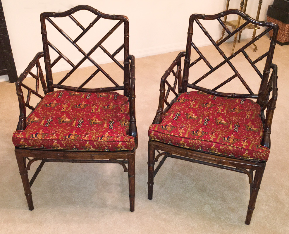PAIR FAUX BAMBOO ORIENTAL STYLE ARM CHAIRS: Carved faux bamboo frame, shaped top and arms, caned seat, oriental motif cushion, 37'' h. x 24 1/2'' x 21 1/2''.