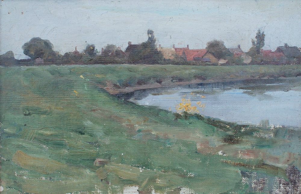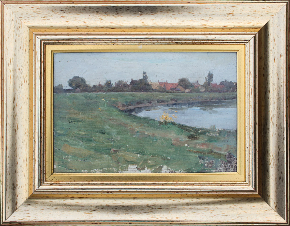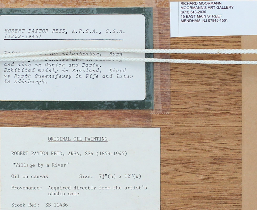 REID, Robert Payton, (English, 1859-1945): ''Village by the River'', Oil/Board, 7.5'' x 12'', unsigned, according to the information, verso acquired directly from the artist's studio sale, custom framed, 14.75'' x 18.5''.