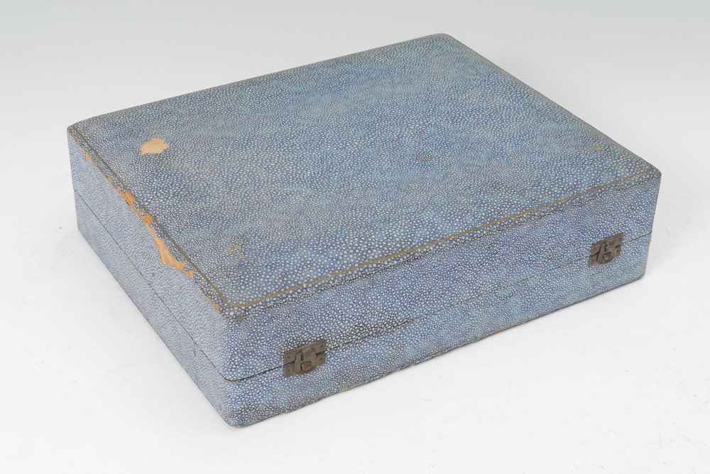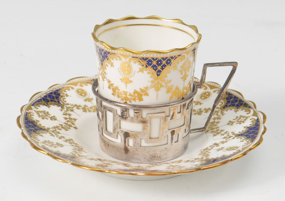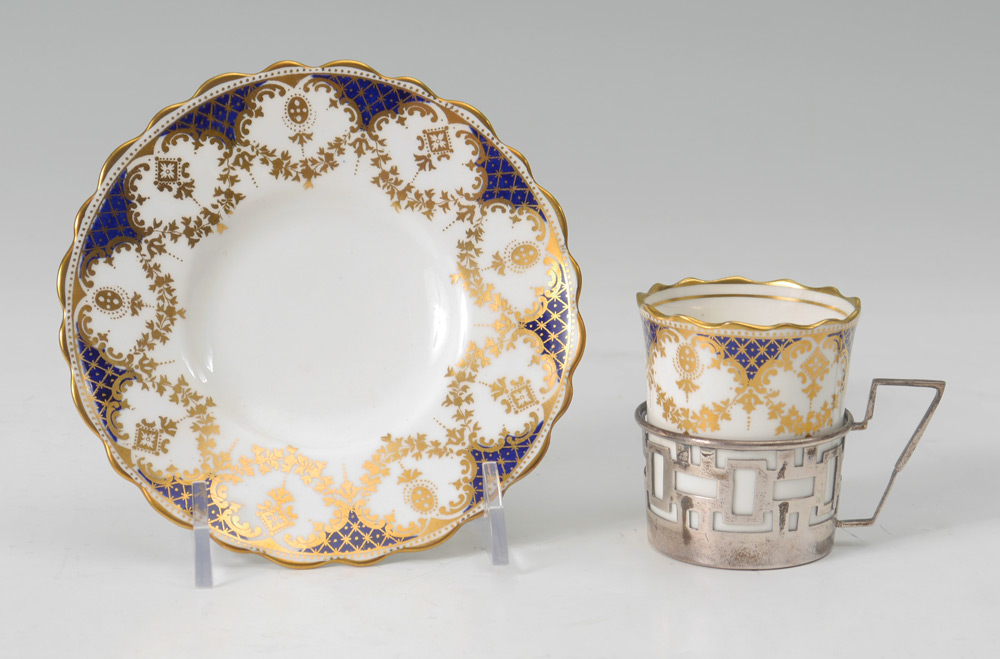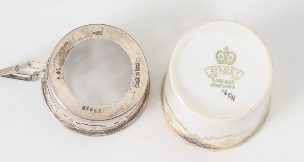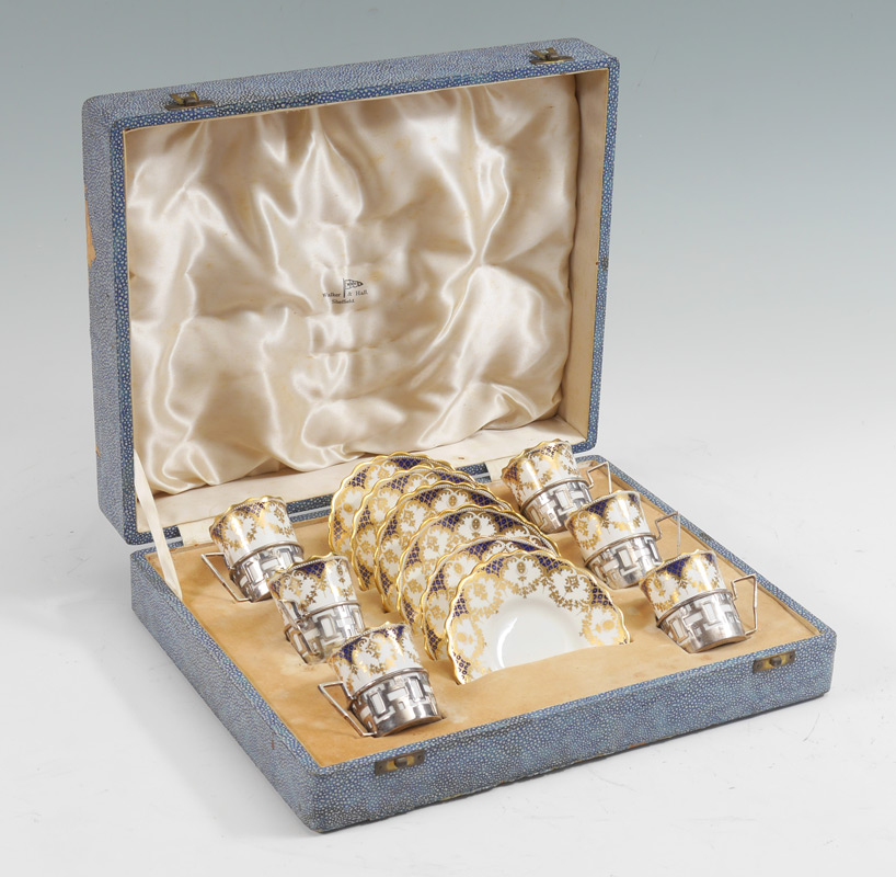 WALKER & HALL AYNSLEY CASED SILVER MOUNTED DEMITASSE SET: Service for 6 with Walker & Hall 1932 Sheffield hallmarked holders, gilt and cobalt decorated inserts and saucers. Sold in original fitted case. 4'' h. x 14'' x 11 1/4''.