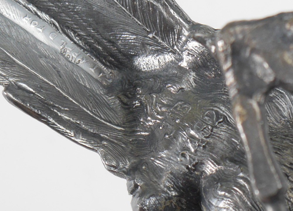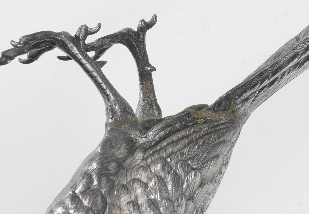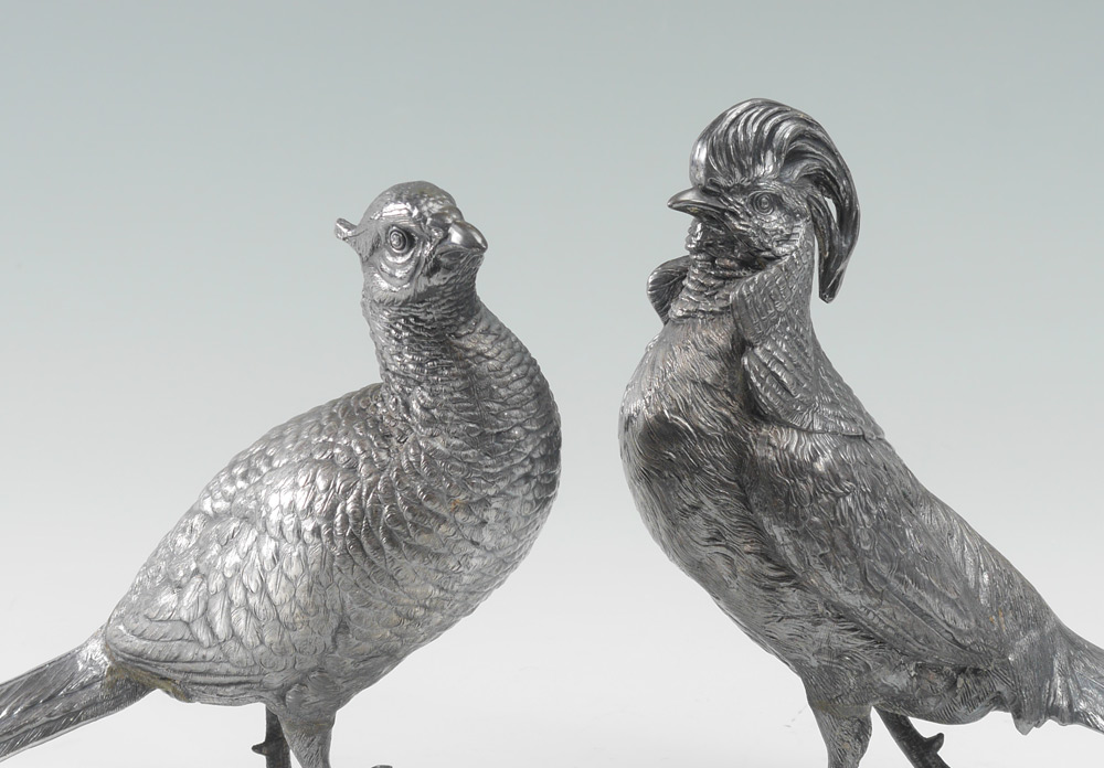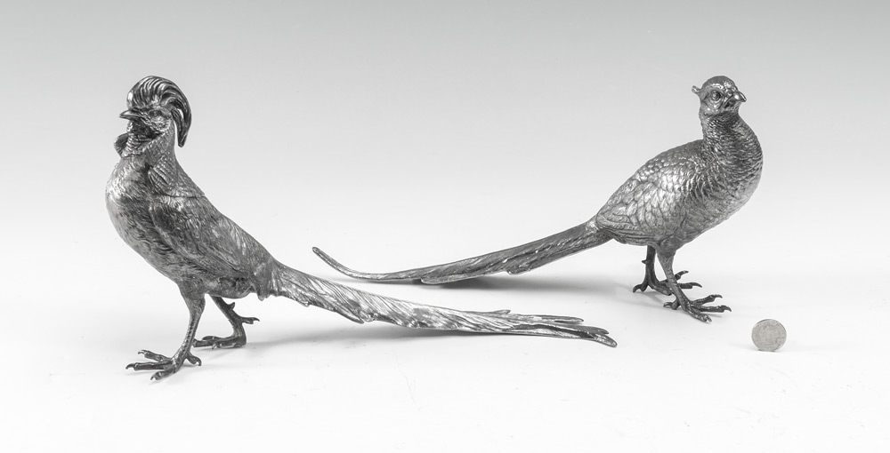 PAIR JENNINGS BROTHERS SILVERPLATE TABLE PHEASANTS: Cock and hen, marked with JB and numbers 2482 & 2483. Cock measures 7 1/2'' h. x 14 1/4''.